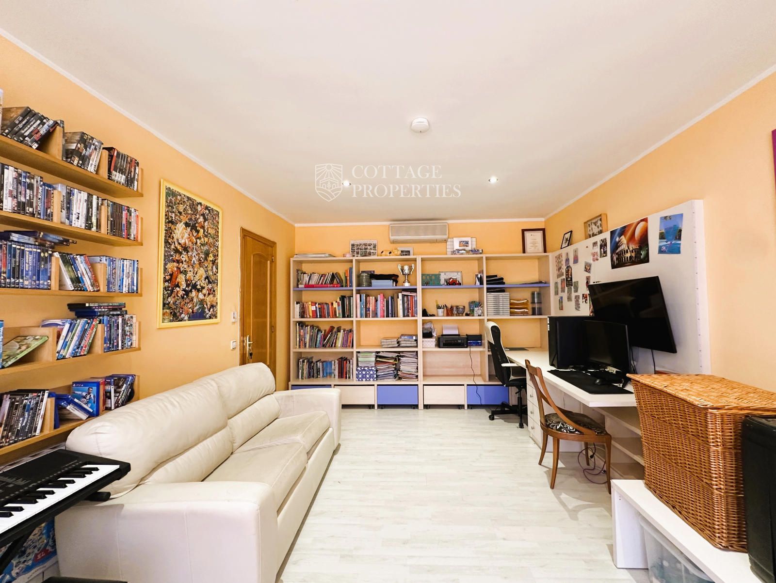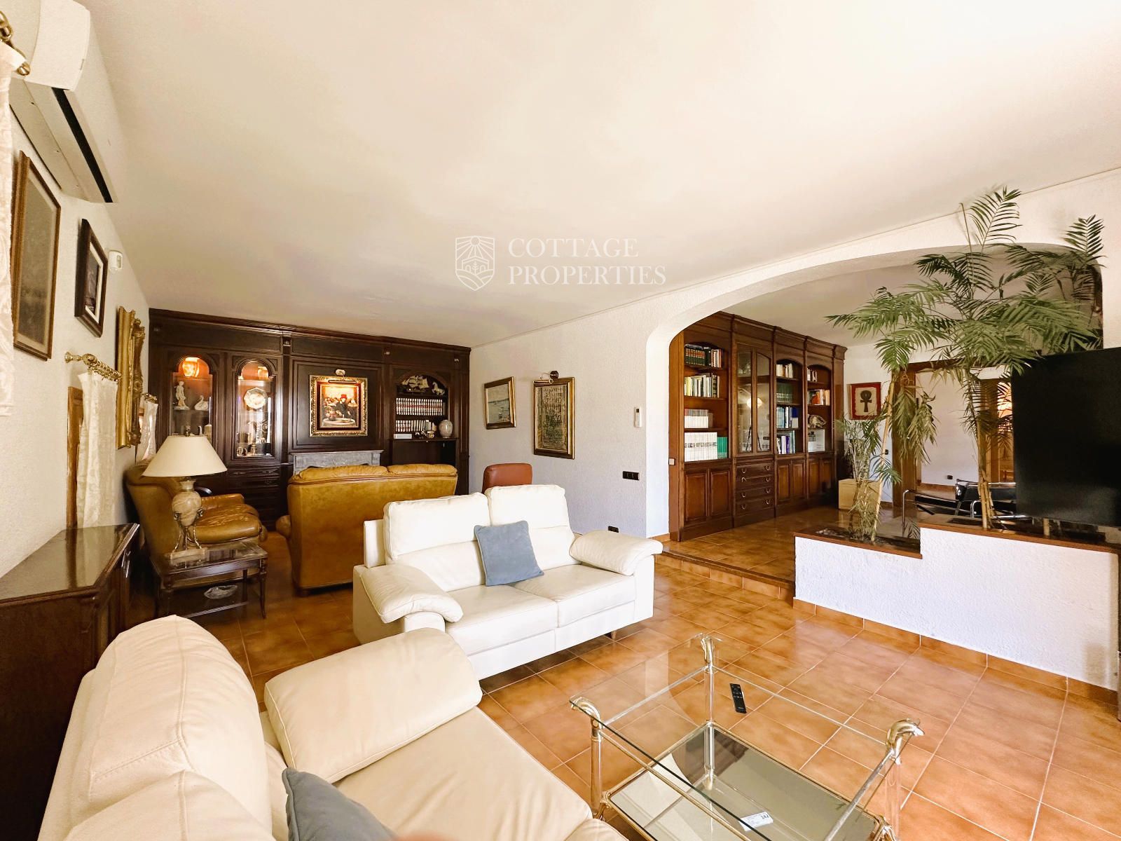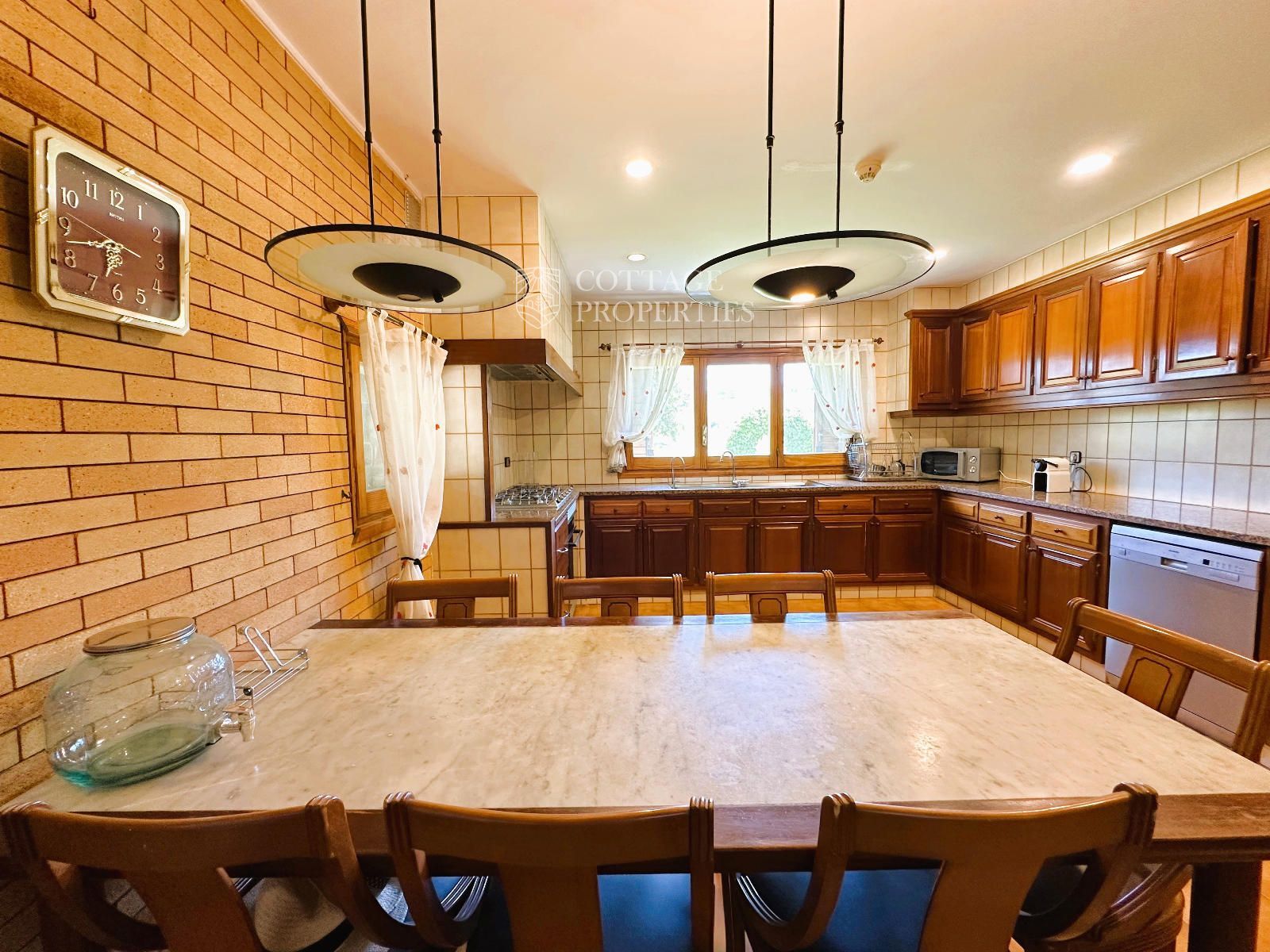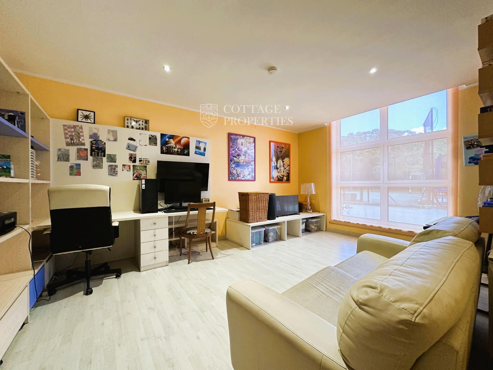 La seconde résidence, rénovée et en excellent état, offre un grand salon-salle à manger avec baies vitrées du sol au plafond et accès direct au jardin, une cuisine spacieuse et lumineuse, une bibliothèque, une salle de sport, une salle de bain supplémentaire et 4 chambres en suite, ainsi qu'une buanderie et un garage indépendant.