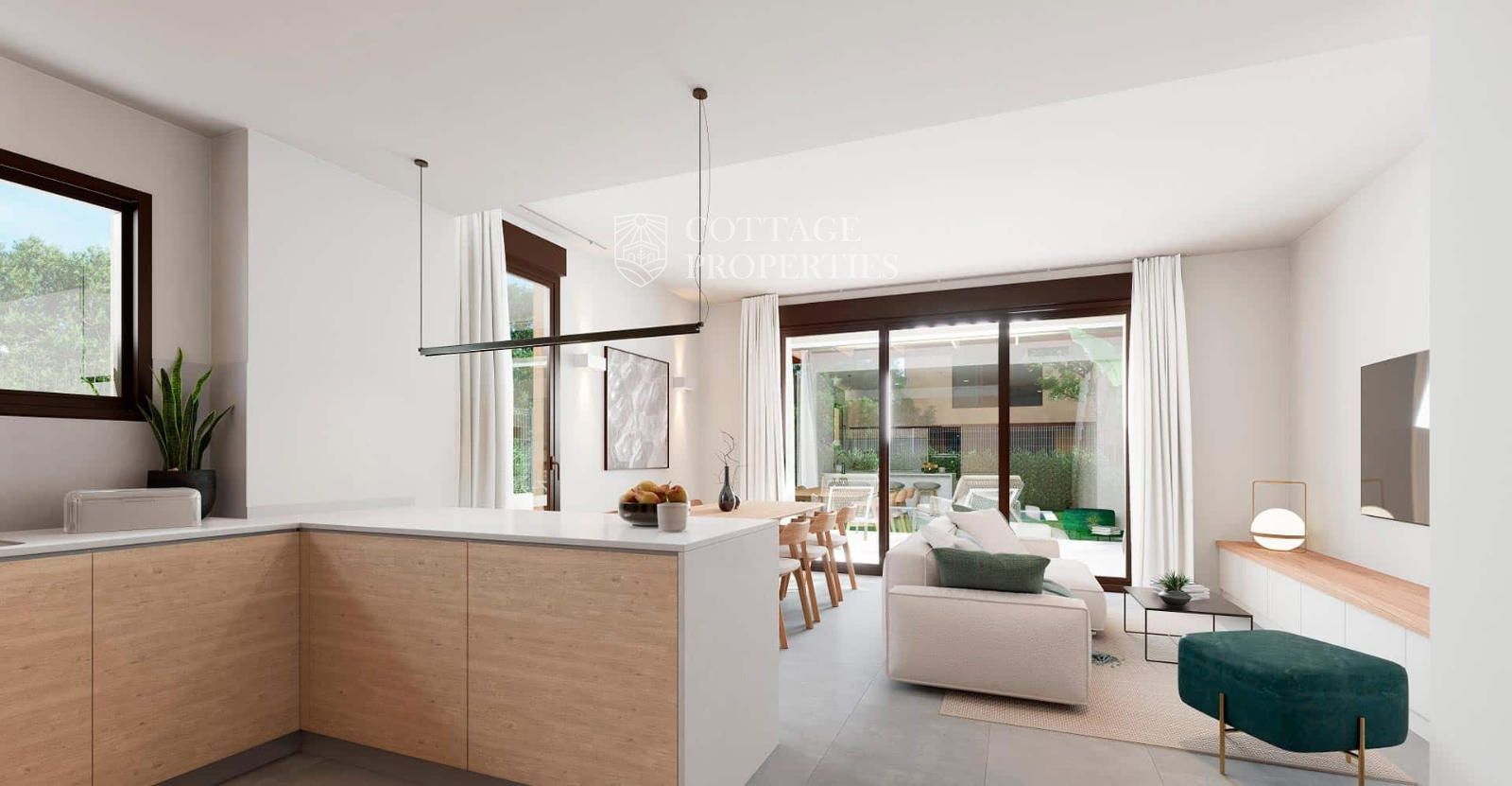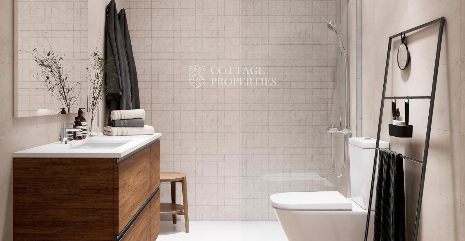 La propriété est répartie sur deux niveaux et dispose d'une surface construite intérieure de 133,81 m² ainsi que d'une surface habitable intérieure de 106,72 m². Le rez-de-chaussée comprend un élégant hall d'entrée donnant accès à une cuisine indépendante au design fonctionnel et à un vaste salon-salle à manger de près de 29 m², conçu comme l'axe central de la maison et offrant un accès direct à la terrasse et au jardin. À ce même niveau se trouve une quatrième chambre, idéale comme chambre d'amis ou bureau, ainsi qu'une salle de bains complète et un espace buanderie, apportant polyvalence et confort.