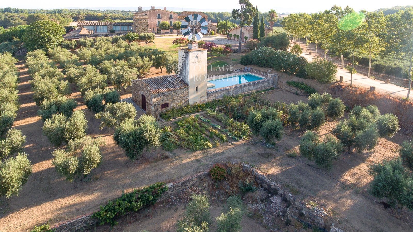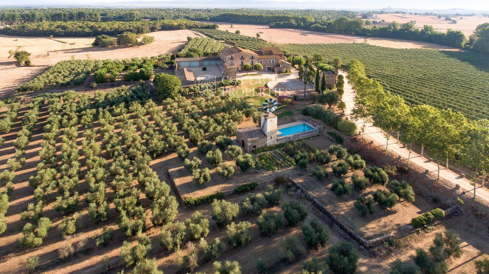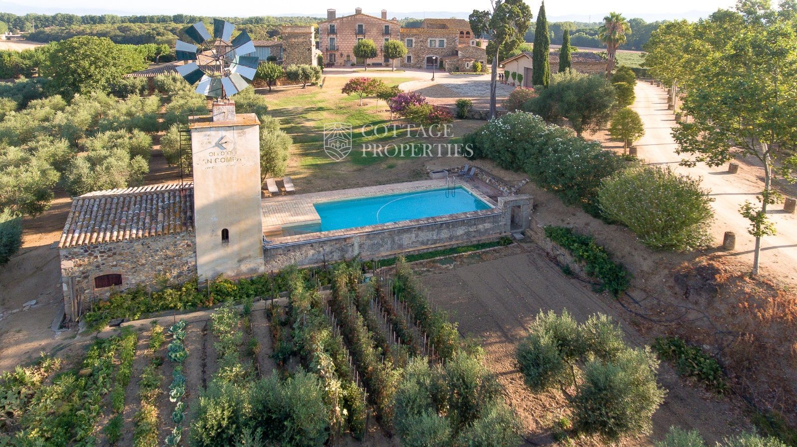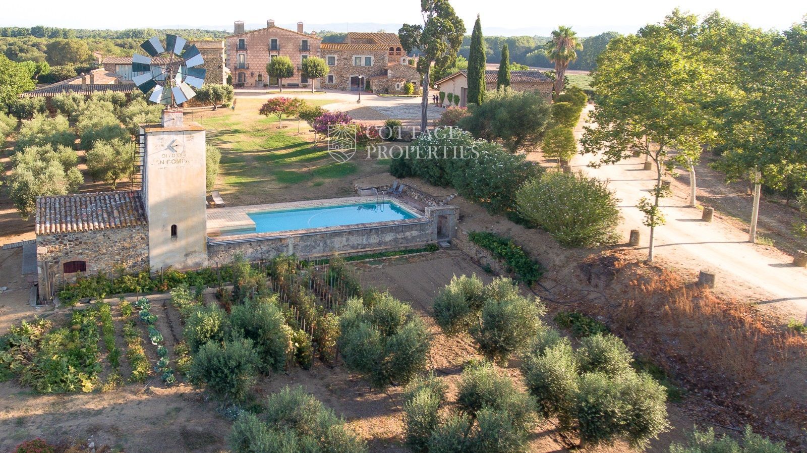 La propriété comprend deux masias entièrement rénovées et une ferme actuellement non opérationnelle. Le terrain comprend 35 hectares d'oliveraies avec une production annuelle de 15 000 litres d'huile d'olive, 15 hectares dédiés à la culture du blé, et un réservoir avec une capacité de 160 000 m³ d'eau, suffisant pour irriguer tout le domaine. La masia principale, datant du XIIe siècle, a été rénovée avec des finitions de très haute qualité tout en préservant son caractère historique.