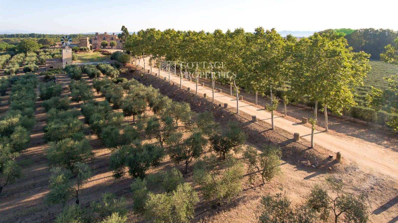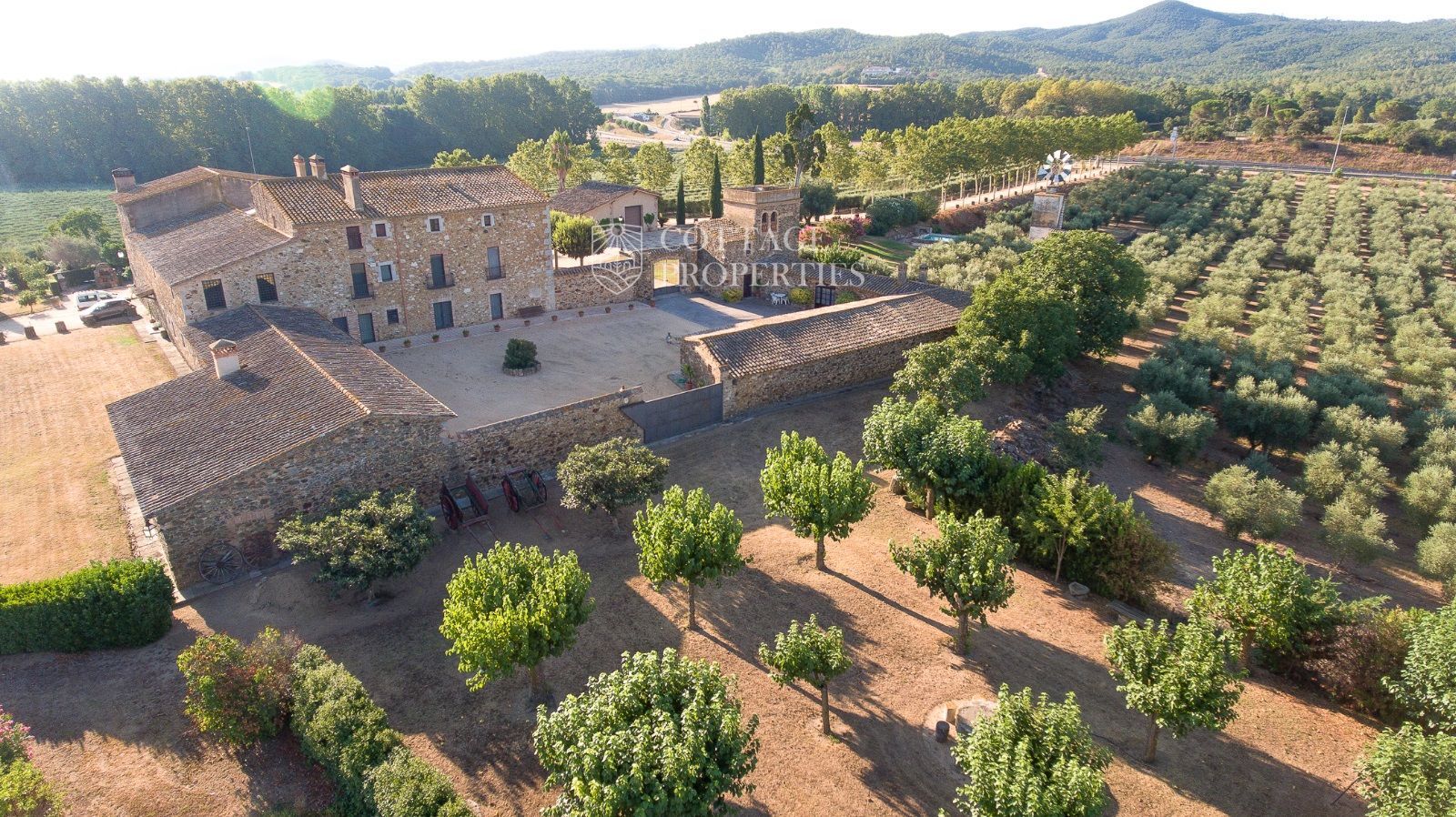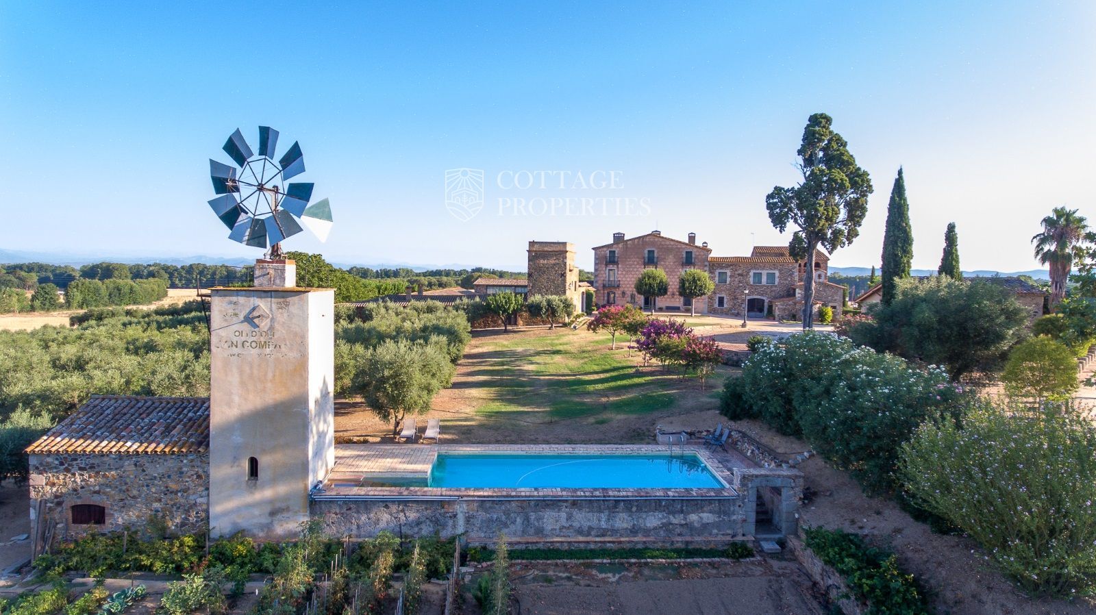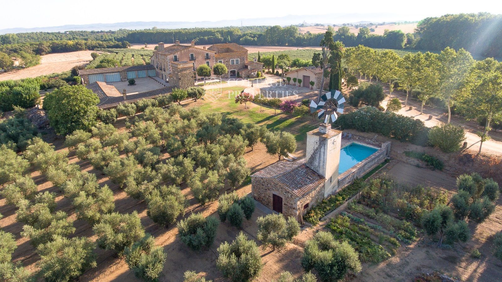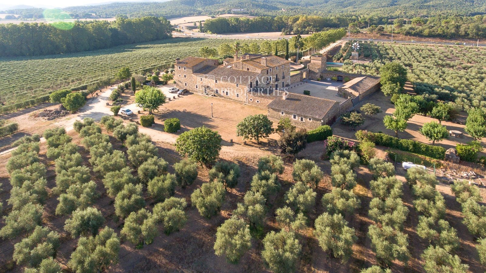 La propriété comprend deux masias entièrement rénovées et une ferme actuellement non opérationnelle. Le terrain comprend 35 hectares d'oliveraies avec une production annuelle de 15 000 litres d'huile d'olive, 15 hectares dédiés à la culture du blé, et un réservoir avec une capacité de 160 000 m³ d'eau, suffisant pour irriguer tout le domaine. La masia principale, datant du XIIe siècle, a été rénovée avec des finitions de très haute qualité tout en préservant son caractère historique.