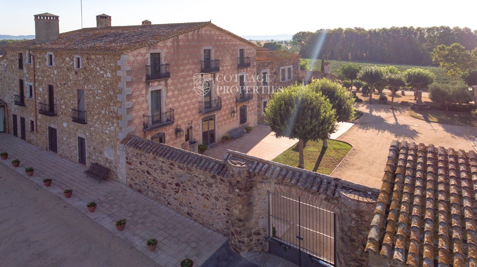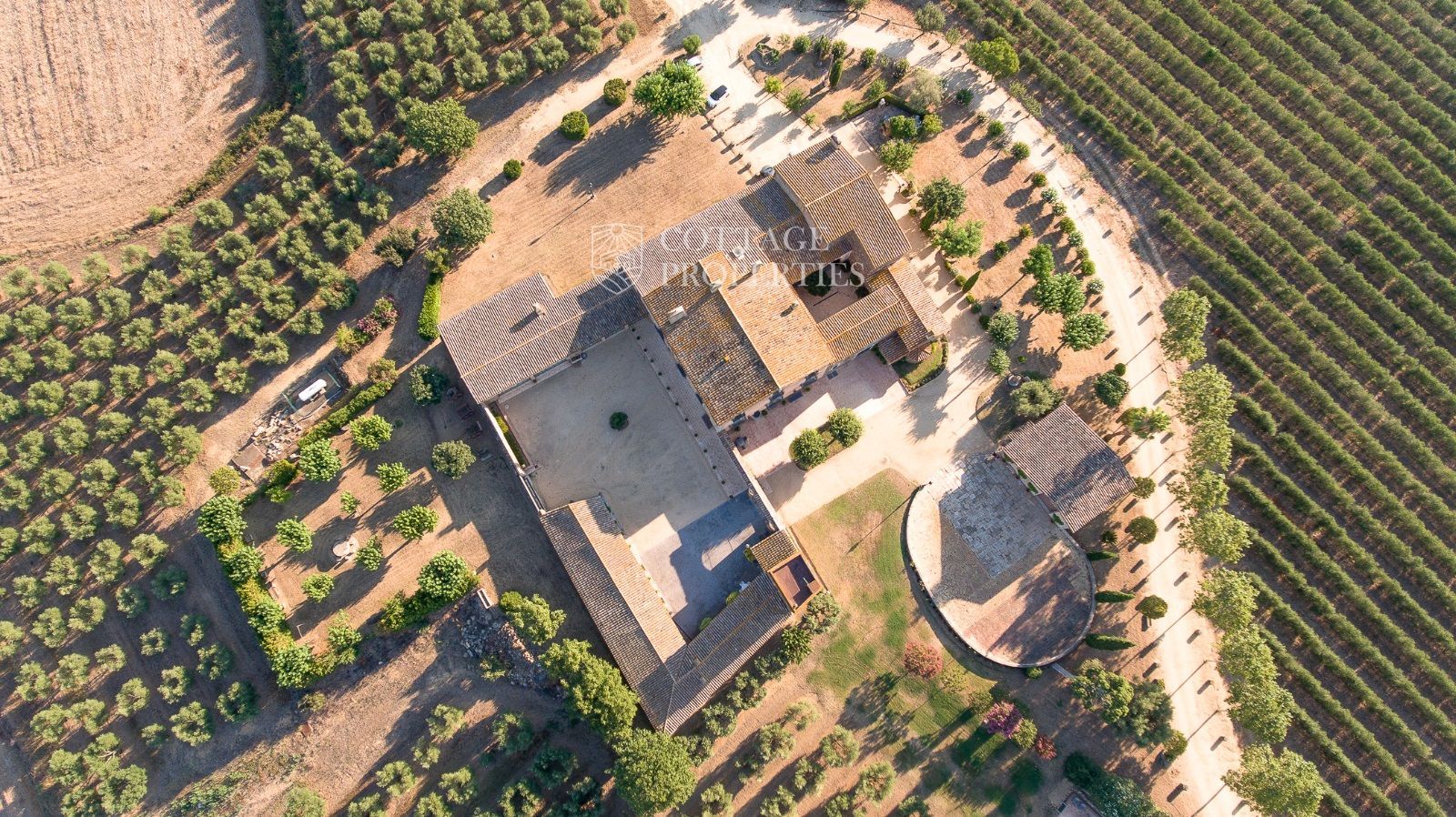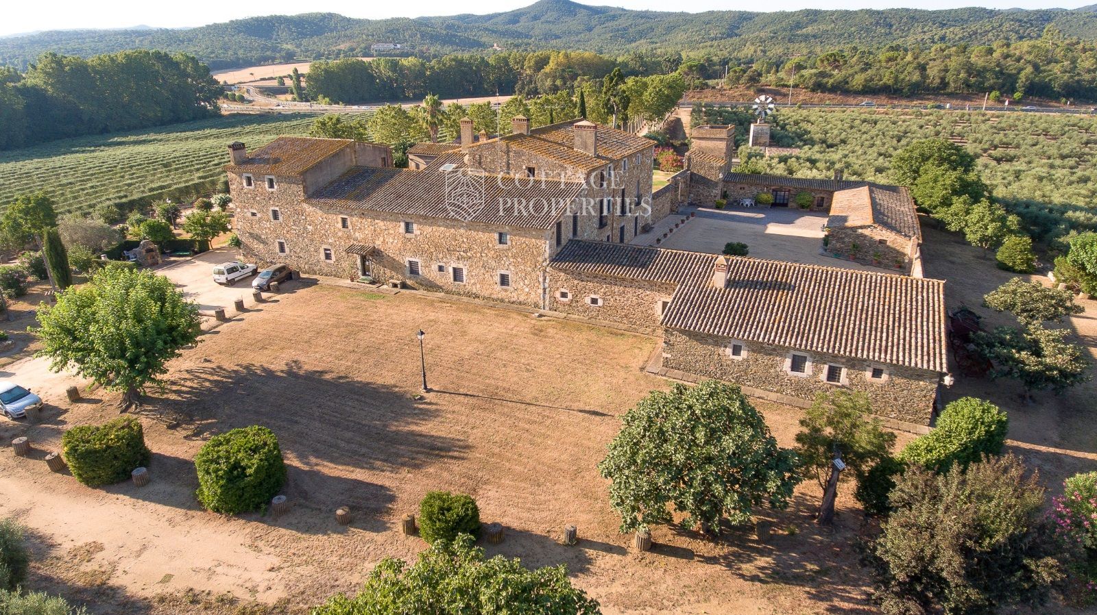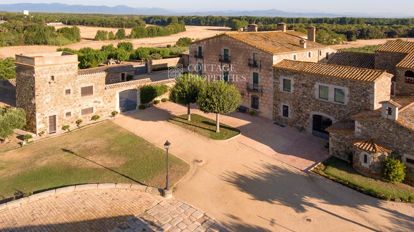 La propriété comprend deux masias entièrement rénovées et une ferme actuellement non opérationnelle. Le terrain comprend 35 hectares d'oliveraies avec une production annuelle de 15 000 litres d'huile d'olive, 15 hectares dédiés à la culture du blé, et un réservoir avec une capacité de 160 000 m³ d'eau, suffisant pour irriguer tout le domaine. La masia principale, datant du XIIe siècle, a été rénovée avec des finitions de très haute qualité tout en préservant son caractère historique.