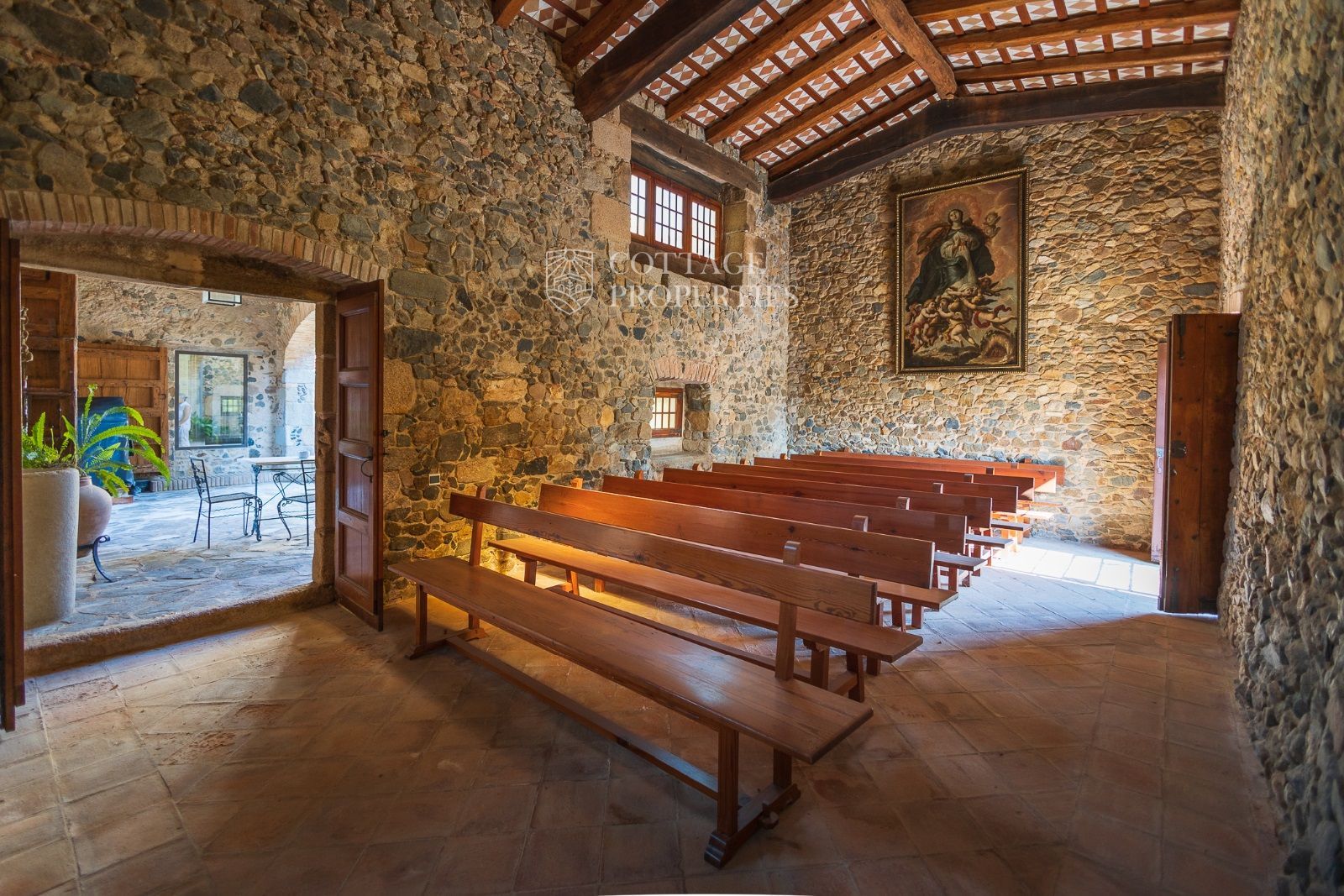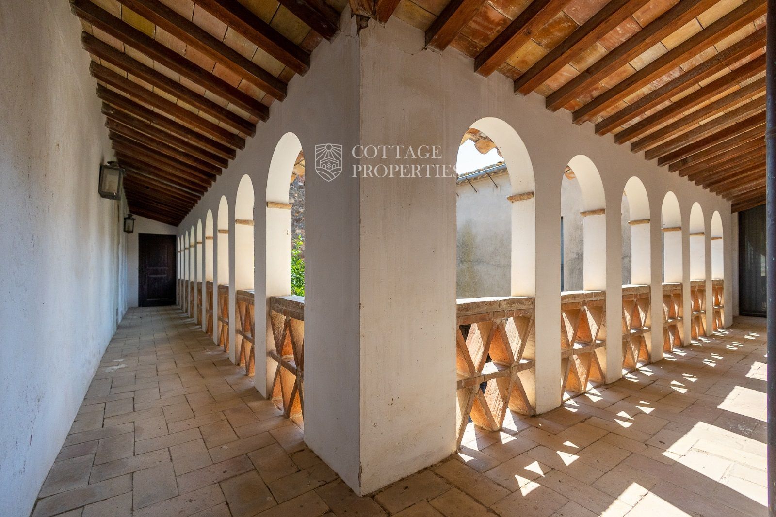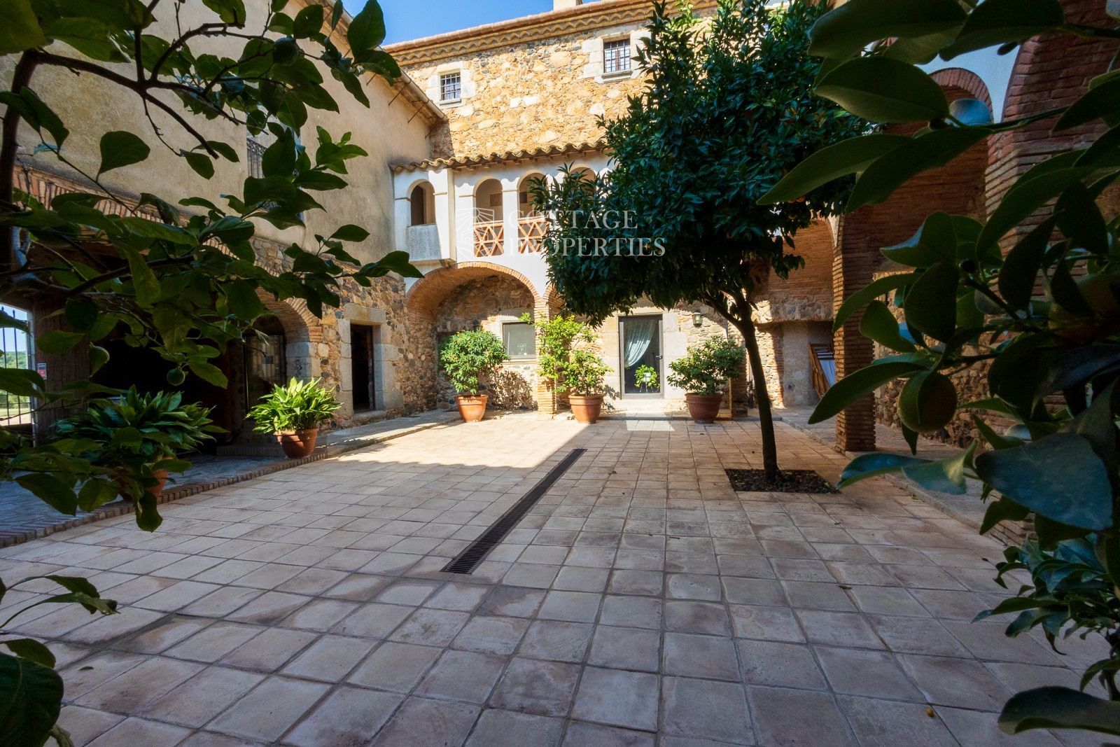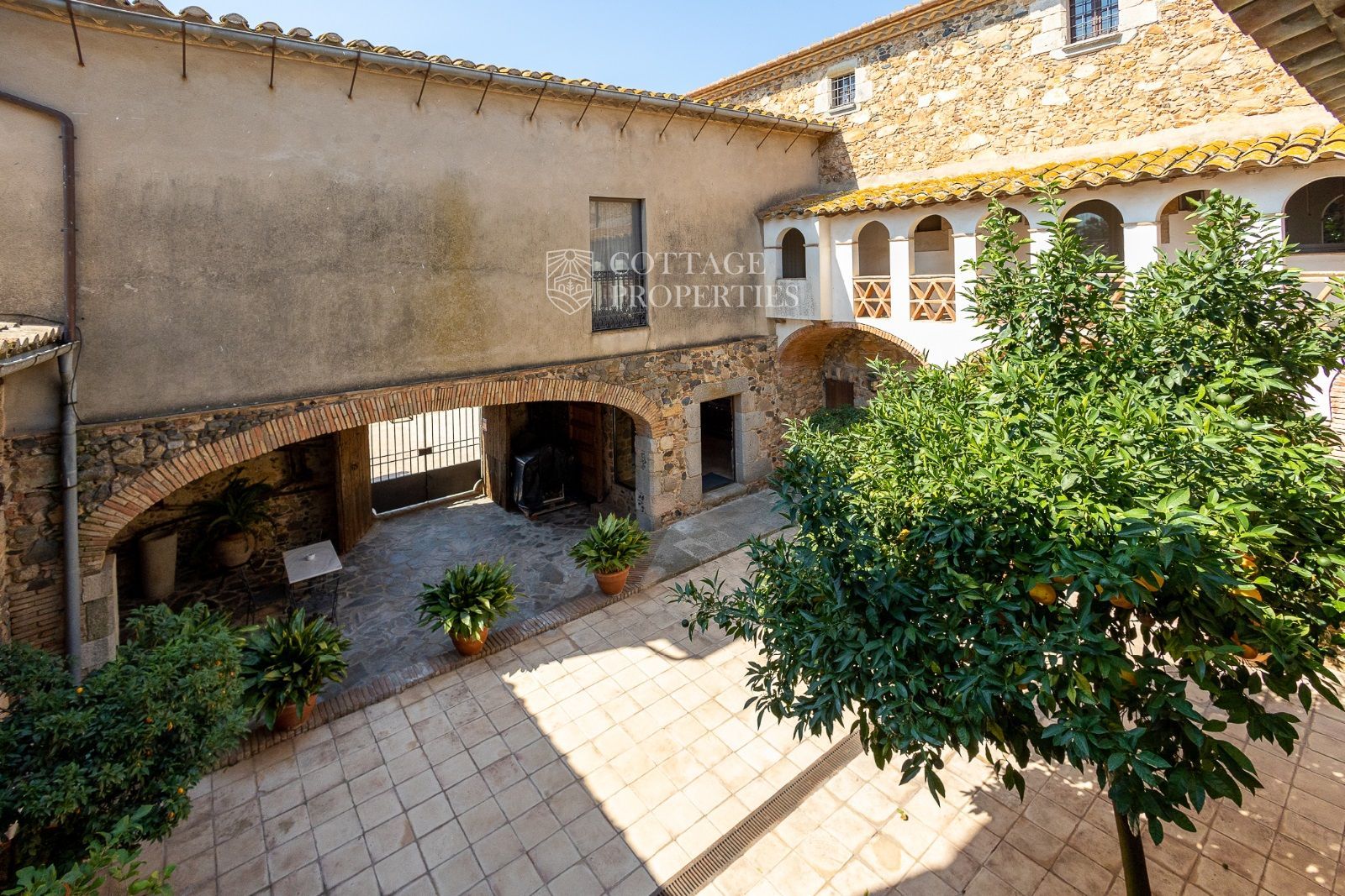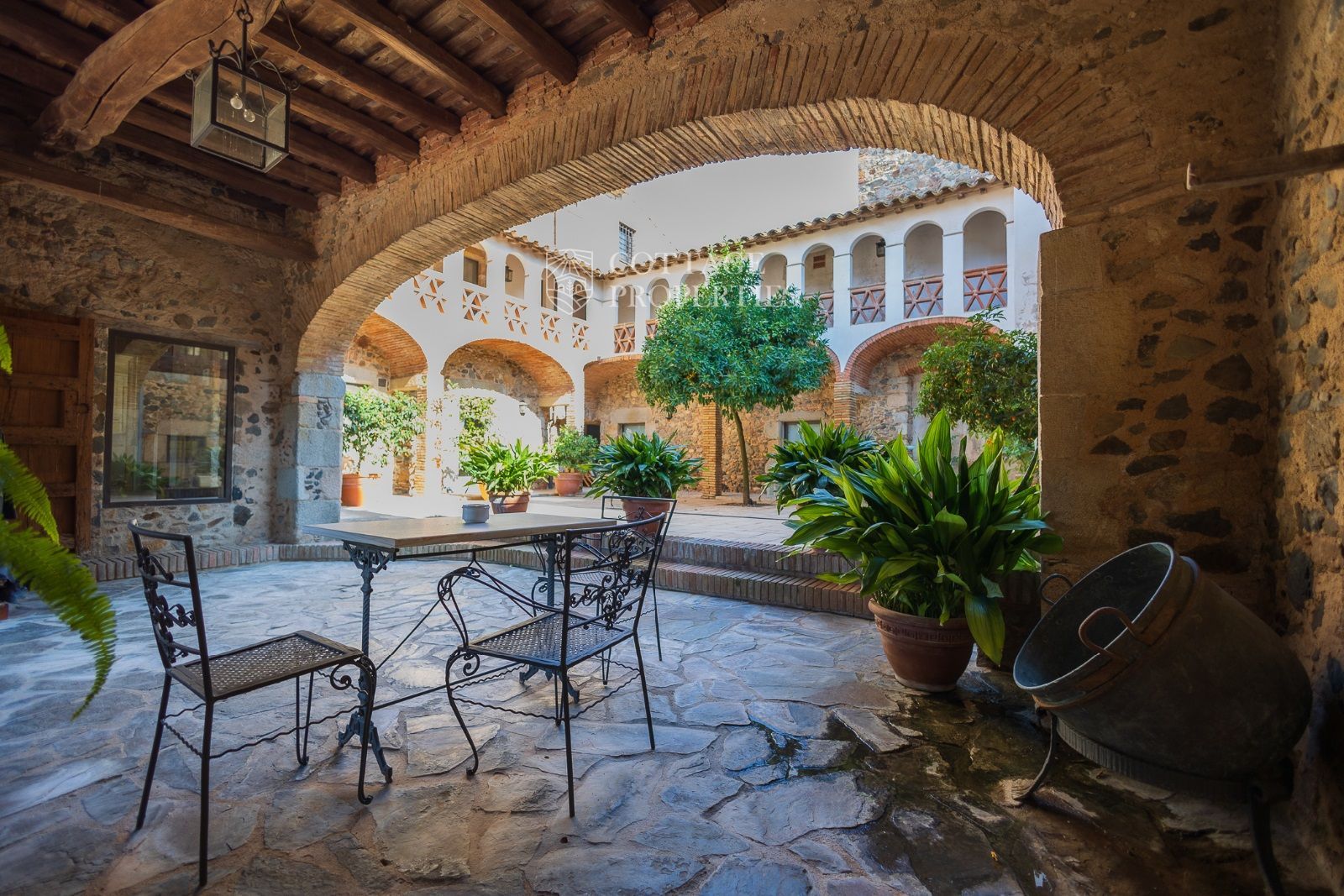 Espaces Extérieurs : Le grand patio intérieur, entouré de voûtes et d'arcades, est dominé par un oranger et a le style d'un majestueux cloître. La propriété dispose également d'un magnifique jardin avec un grand porche d'été et une piscine. De plus, elle comprend sa propre chapelle et une maison d'invités.