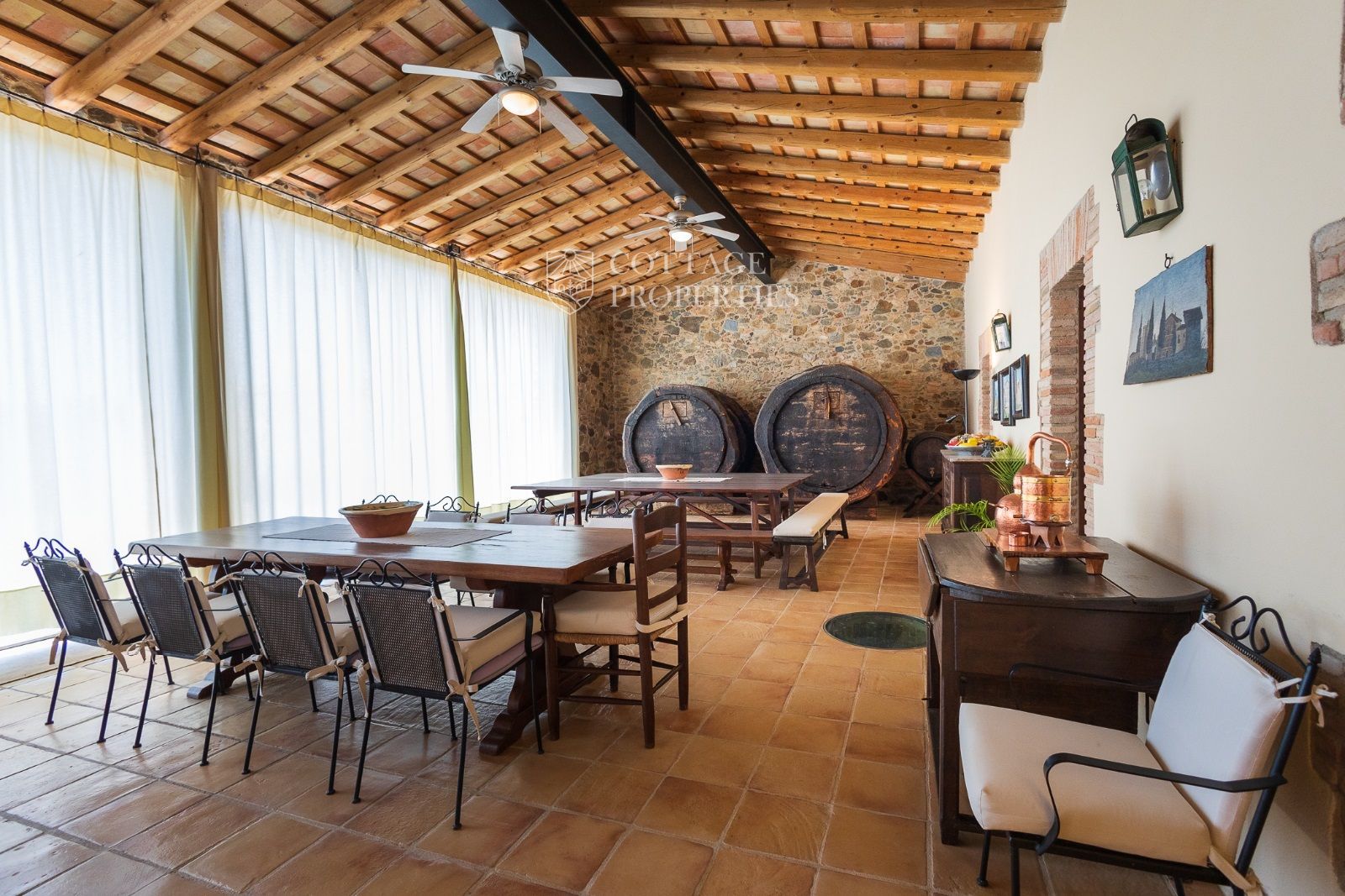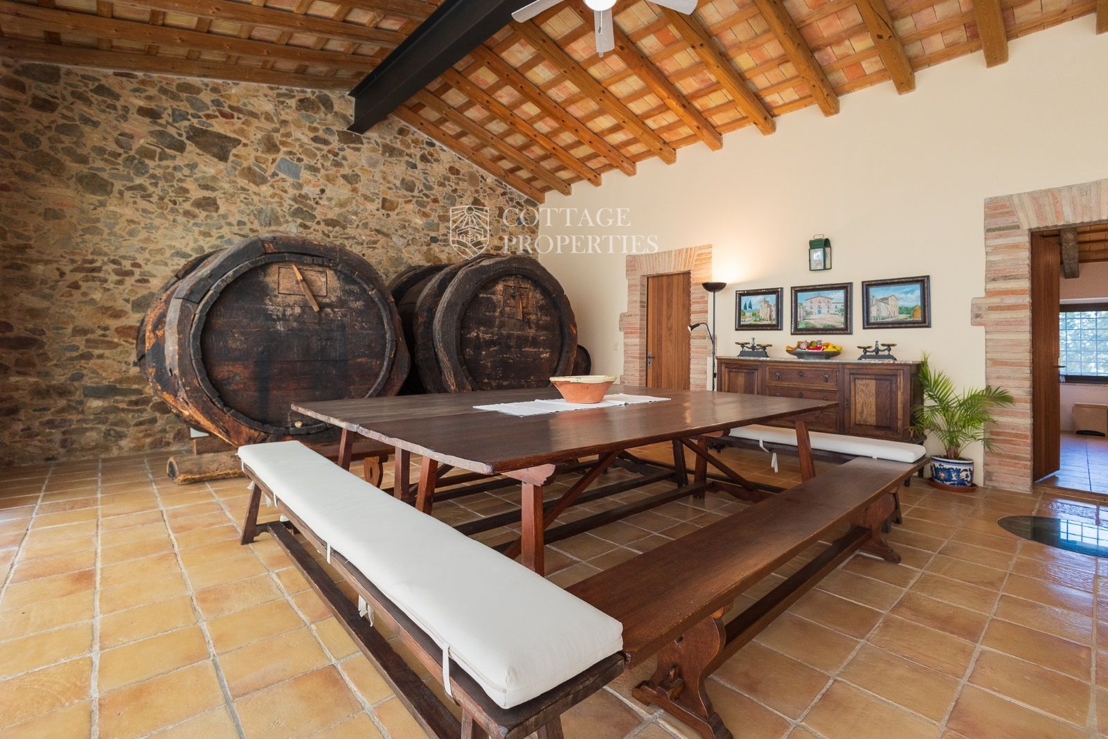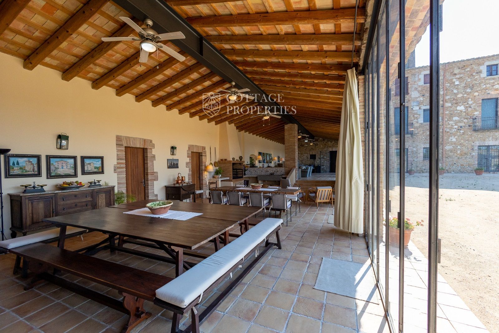 Masia Principale : Répartie sur trois étages, la masia dispose de 12 grandes chambres et 9 salles de bains, ainsi que d'immenses et majestueux halls d'entrée, salles à manger, salons, bureaux et une grande bibliothèque. Elle conserve des éléments historiques tels que des murs en pierre, des voûtes catalanes, des fresques et d'autres merveilles architecturales.