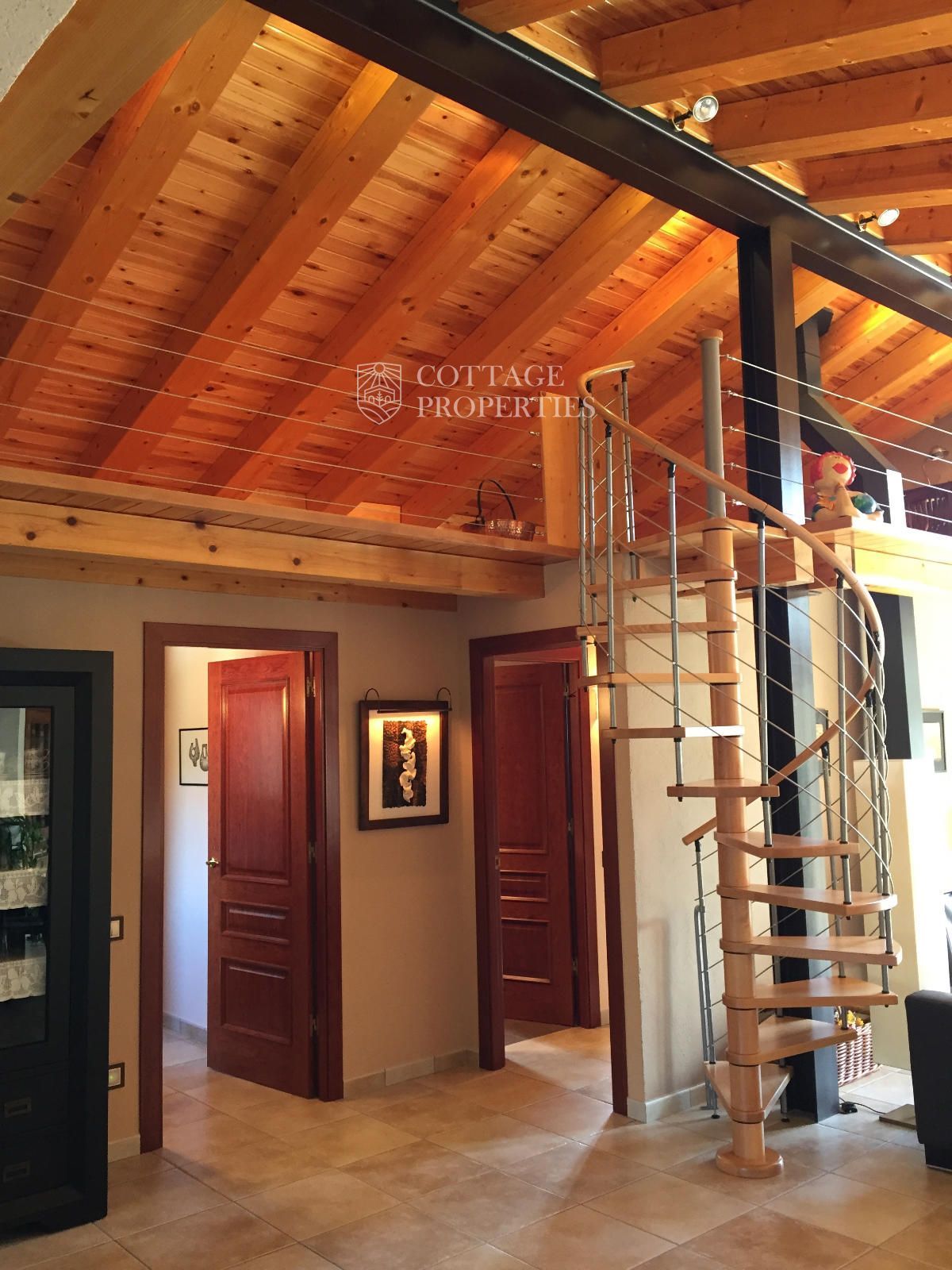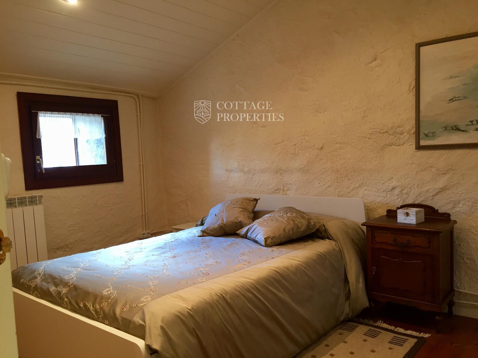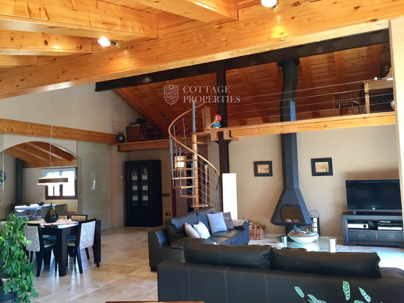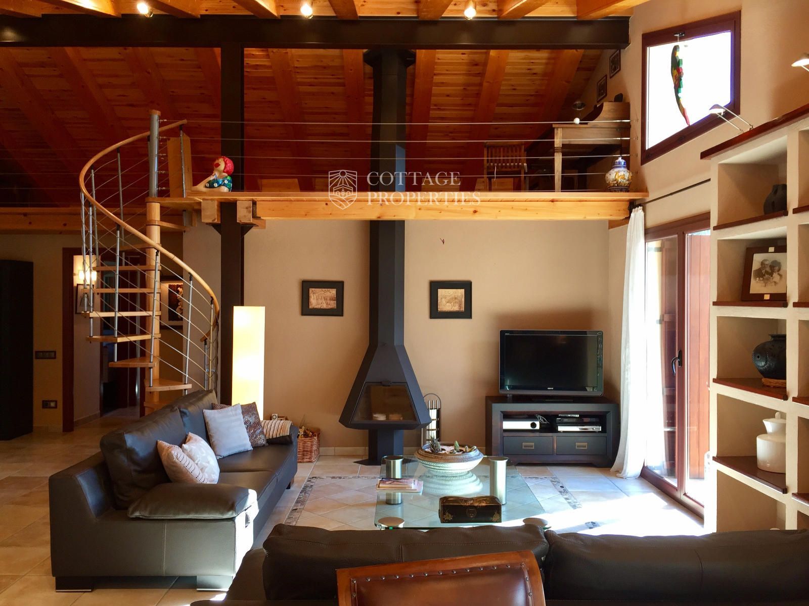 Le premier étage de la masia se distingue par son design lumineux et accueillant avec un porche couvert de 15 m² parfait pour profiter des moments en extérieur, un salon-salle à manger de double hauteur combinant élégance avec une cheminée design et une bibliothèque, une cuisine ouverte équipée de portes coulissantes en verre et d'un poêle nordique apportant de la chaleur, deux chambres doubles, chacune avec une salle de bain en suite pour plus d'intimité, et une mezzanine en bois ouverte idéale comme espace multifonctionnel.