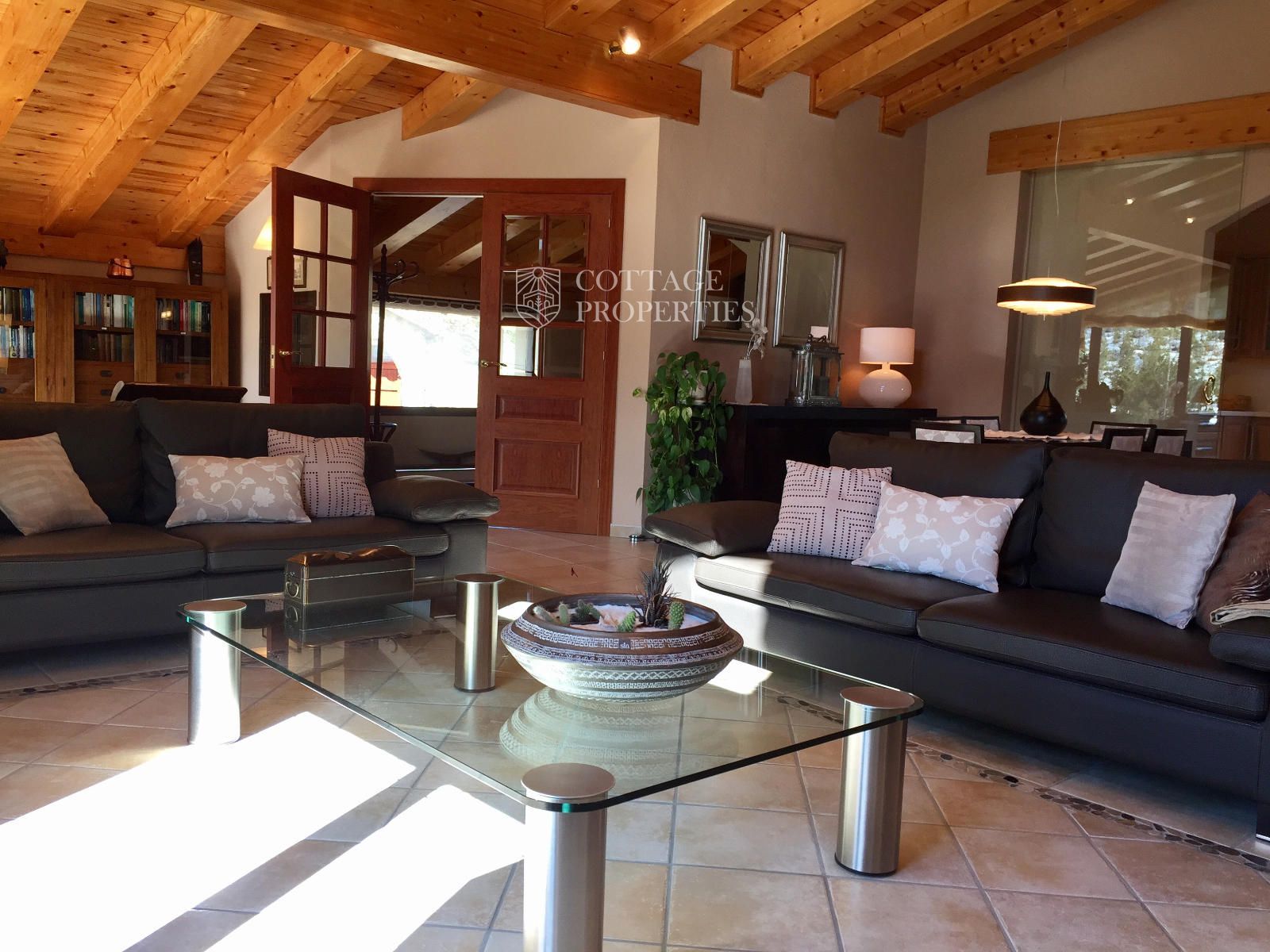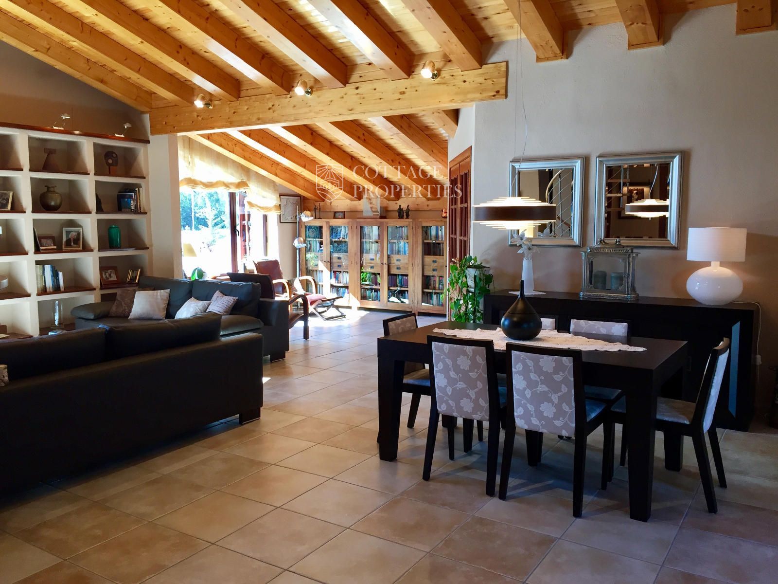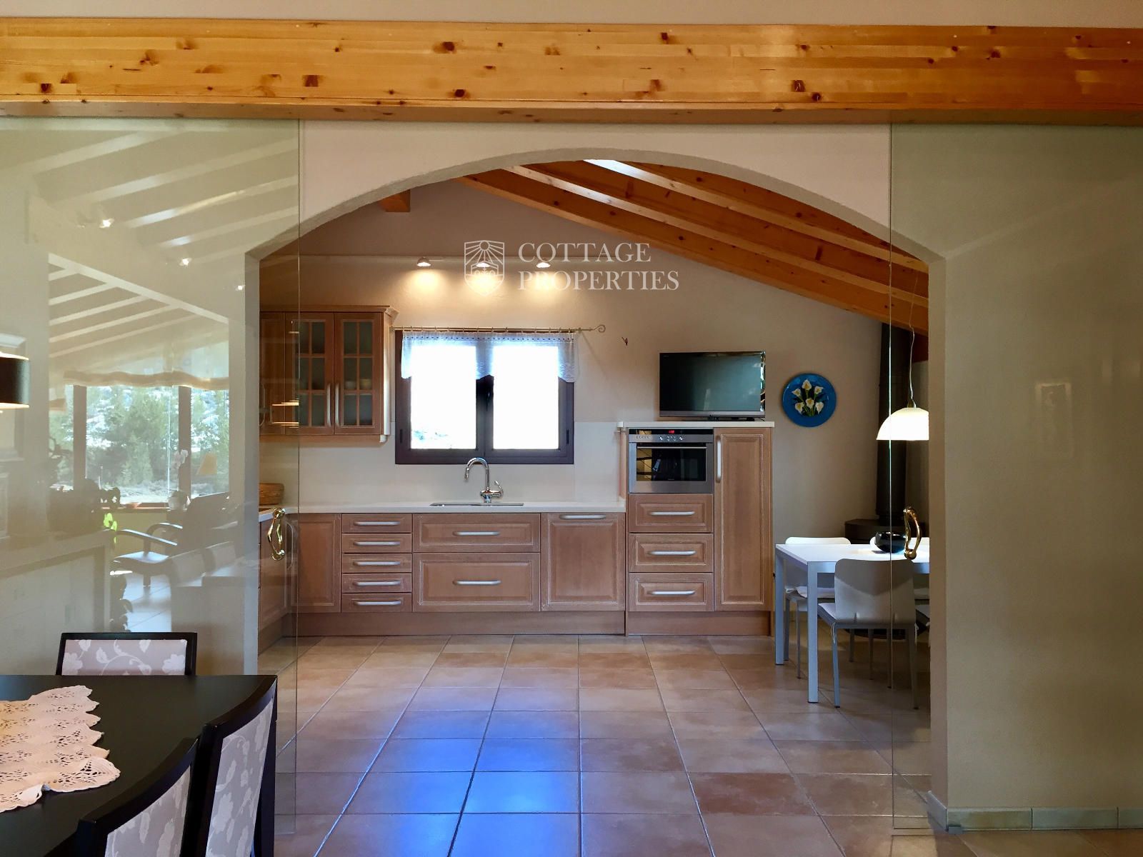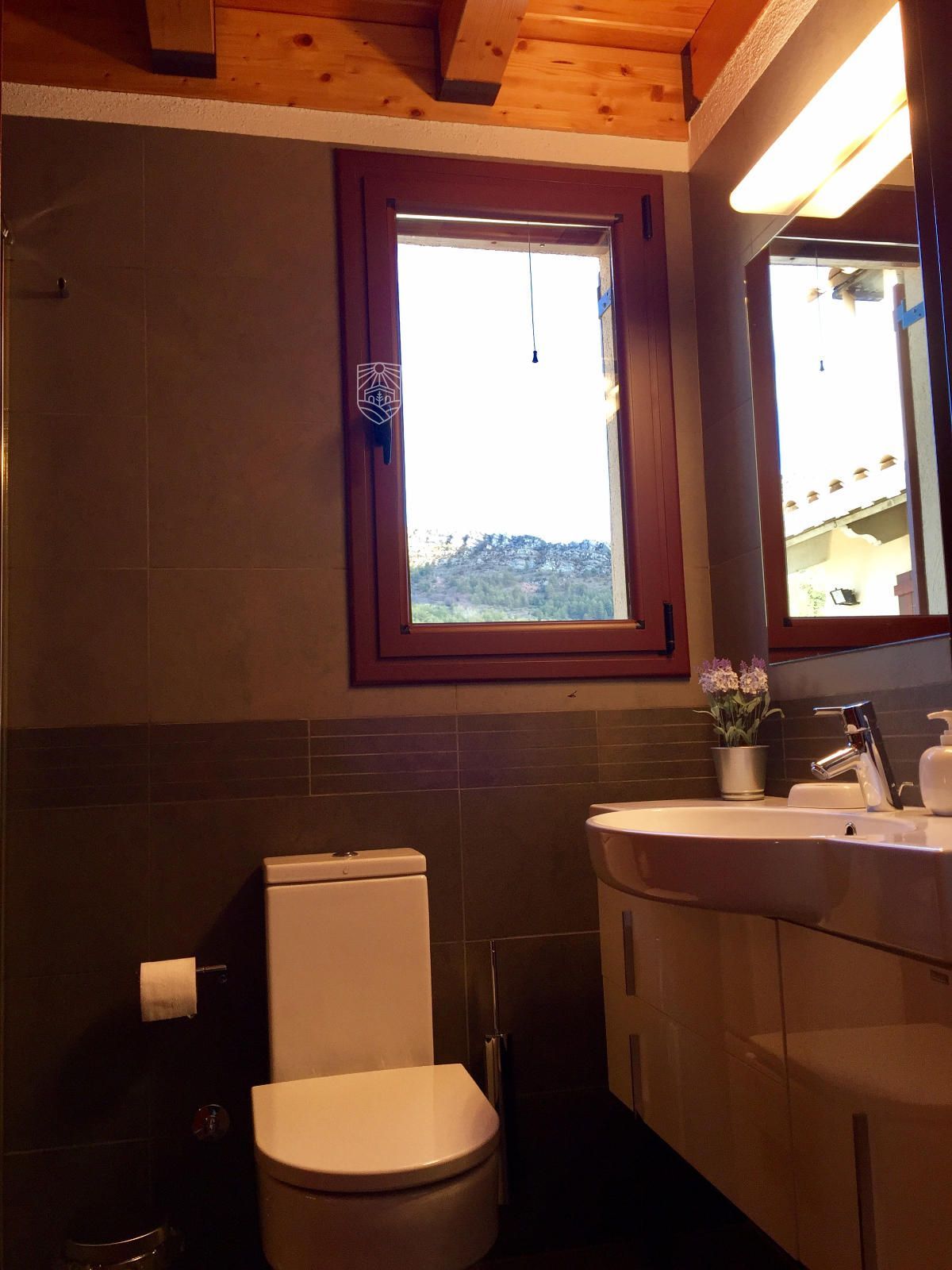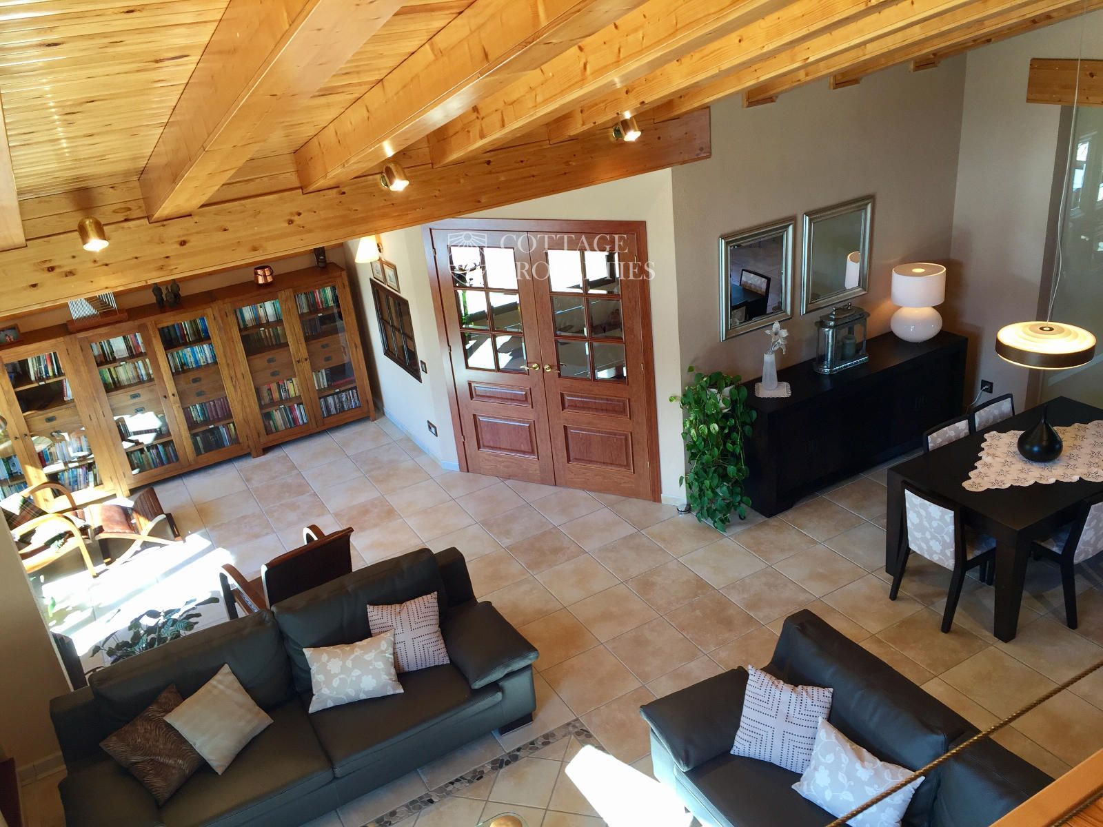 Le premier étage de la masia se distingue par son design lumineux et accueillant avec un porche couvert de 15 m² parfait pour profiter des moments en extérieur, un salon-salle à manger de double hauteur combinant élégance avec une cheminée design et une bibliothèque, une cuisine ouverte équipée de portes coulissantes en verre et d'un poêle nordique apportant de la chaleur, deux chambres doubles, chacune avec une salle de bain en suite pour plus d'intimité, et une mezzanine en bois ouverte idéale comme espace multifonctionnel.