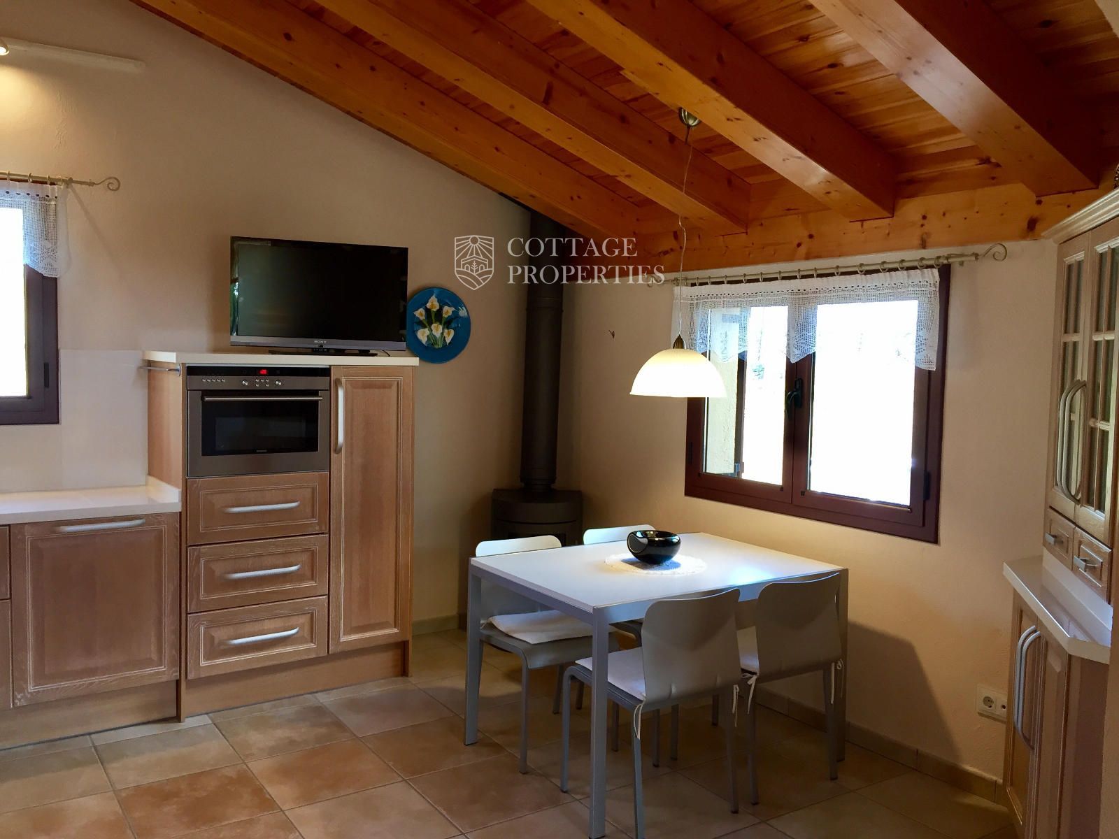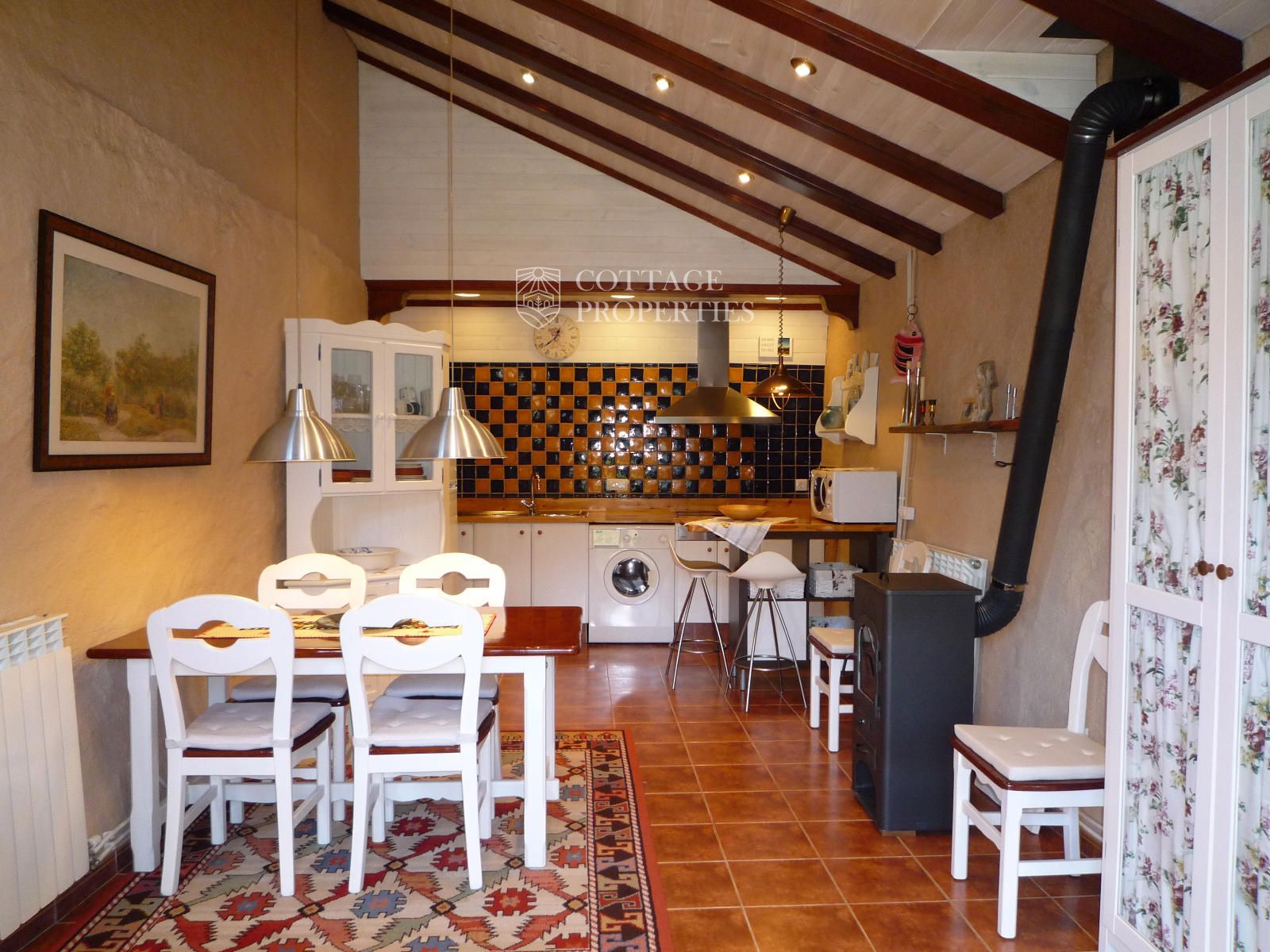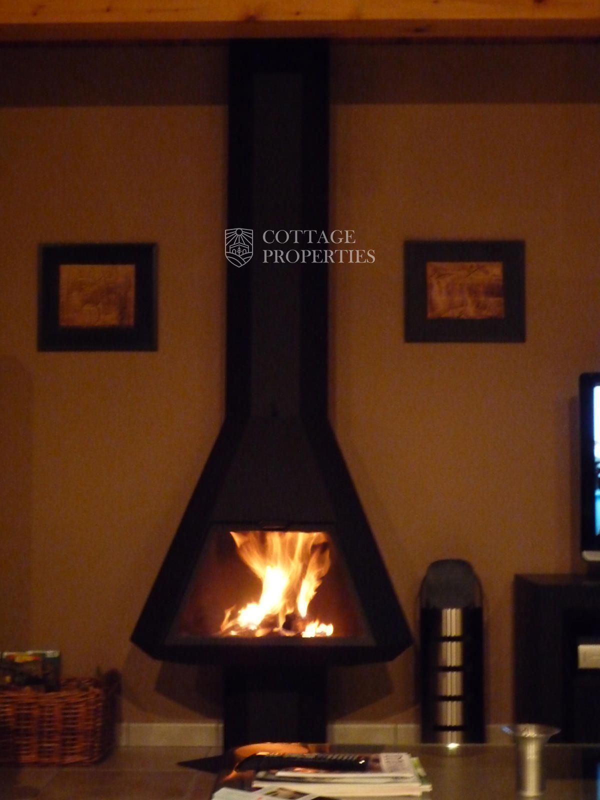 Une salle à manger avec un poêle à bois et une cuisine intégrée qui créent une atmosphère rustique et conviviale, un salon avec cheminée apportant une touche chaleureuse à l'espace et une salle de bain complète avec douche.