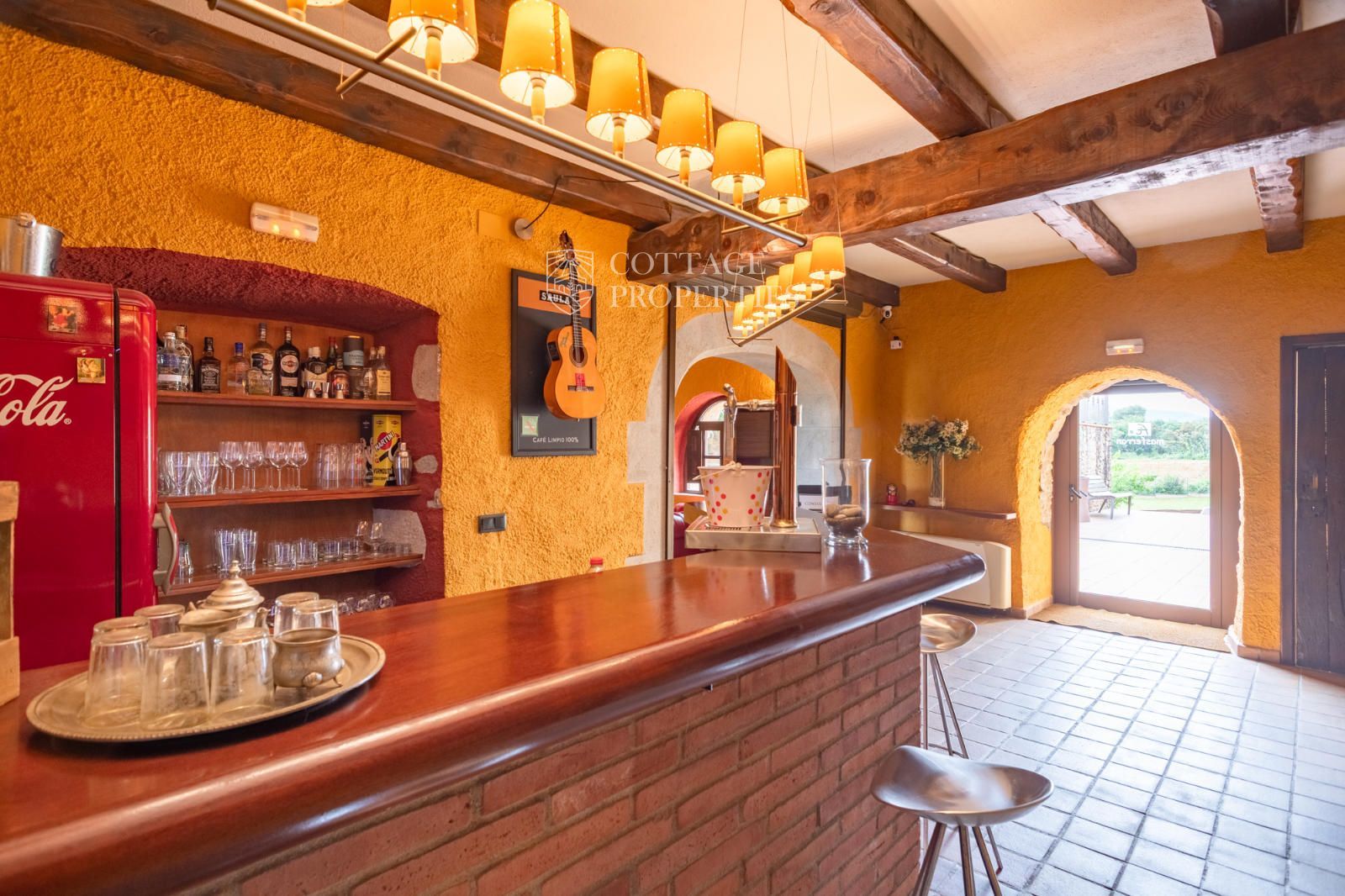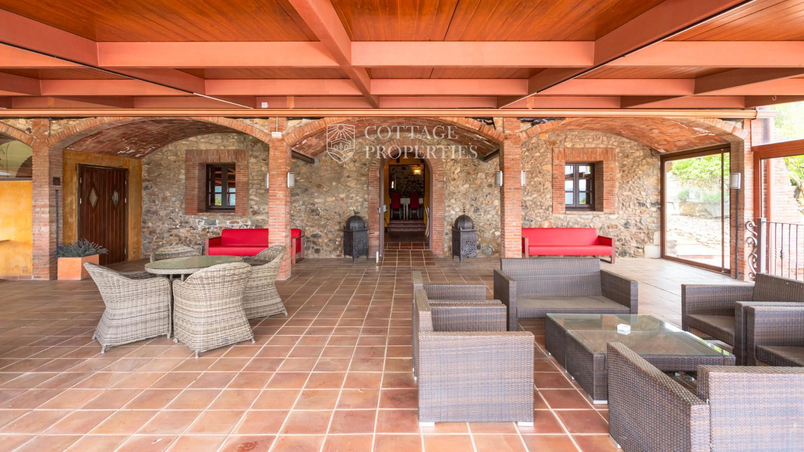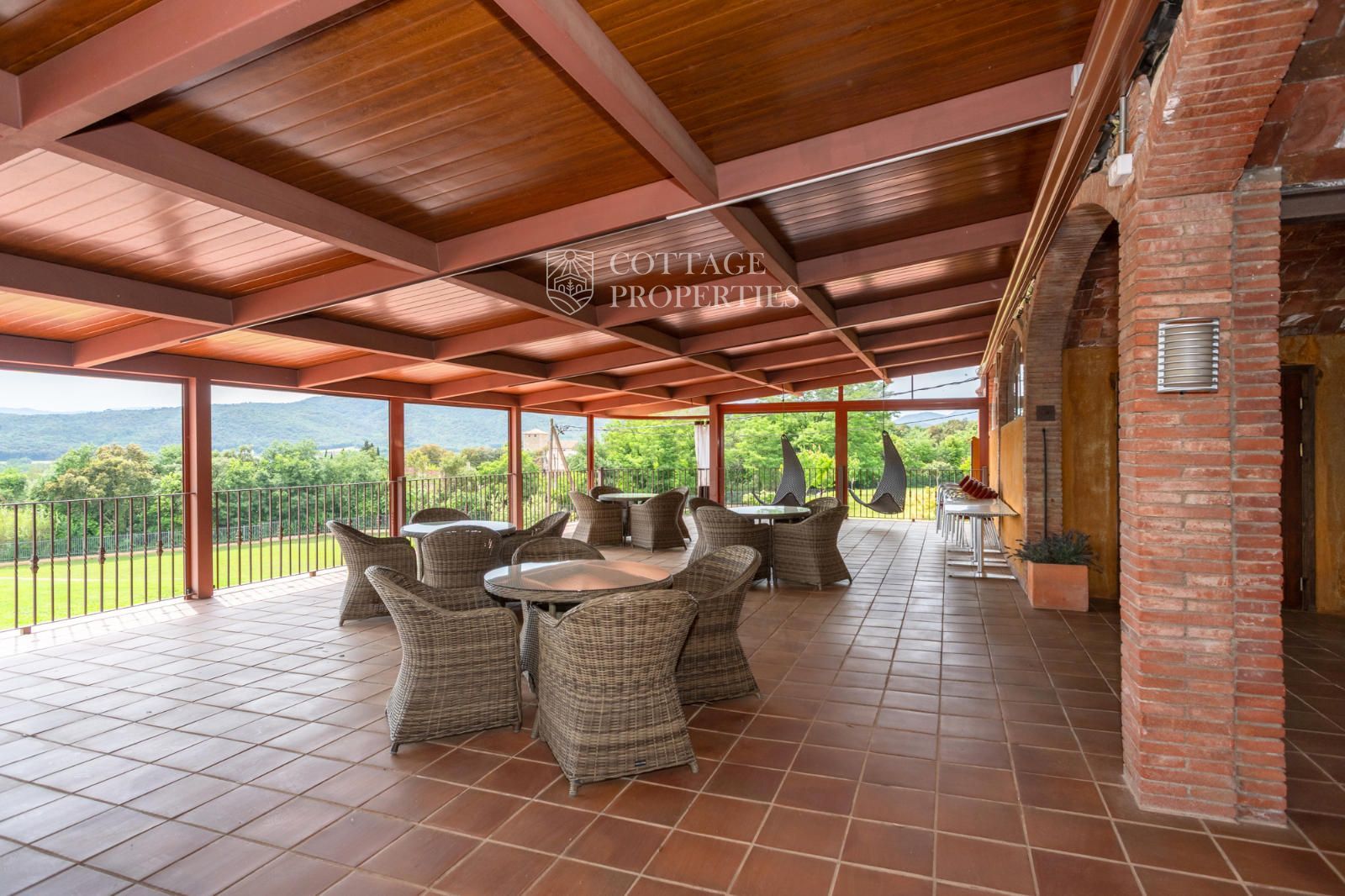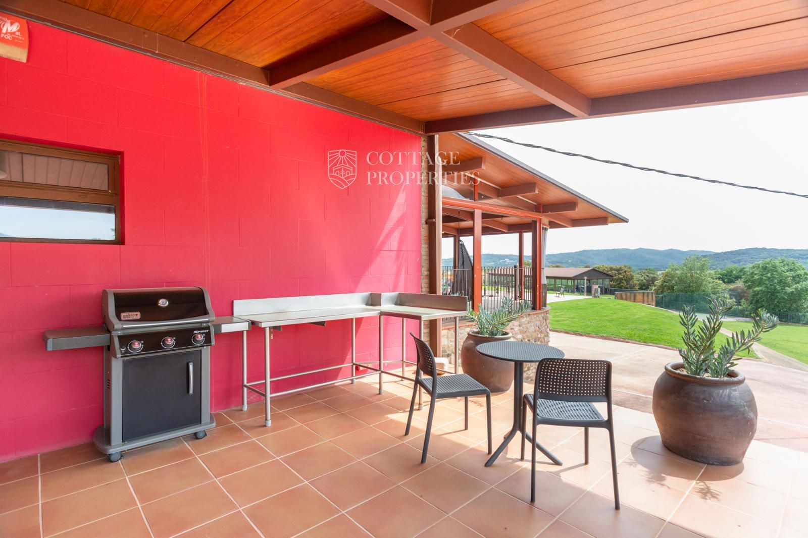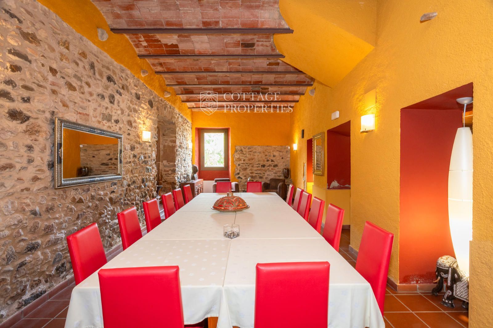 La masia comprend une accueillante salle de réception, une salle de réunion, un coin télévision avec bar, une cave, une bibliothèque, deux grandes salles à manger et une vaste cuisine professionnelle équipée pour le service traiteur. Une terrasse couverte, idéale pour les dîners d'été, communique avec les espaces extérieurs. Au premier étage, on trouve 9 chambres avec salle de bain privée, et au deuxième étage, les 3 chambres restantes, également avec salle de bain. Toutes les chambres sont équipées de climatisation, chauffage central, télévision et téléphone. Un bâtiment indépendant avec entrée privée, adjacent à la bâtisse principale, est actuellement en cours de rénovation pour être transformé en loft. De plus, dans le jardin, il y a une salle d'événements de 100 m² avec vue sur la vallée, et à l'étage inférieur se trouvent vestiaires, salle de sport, sauna et rangements.