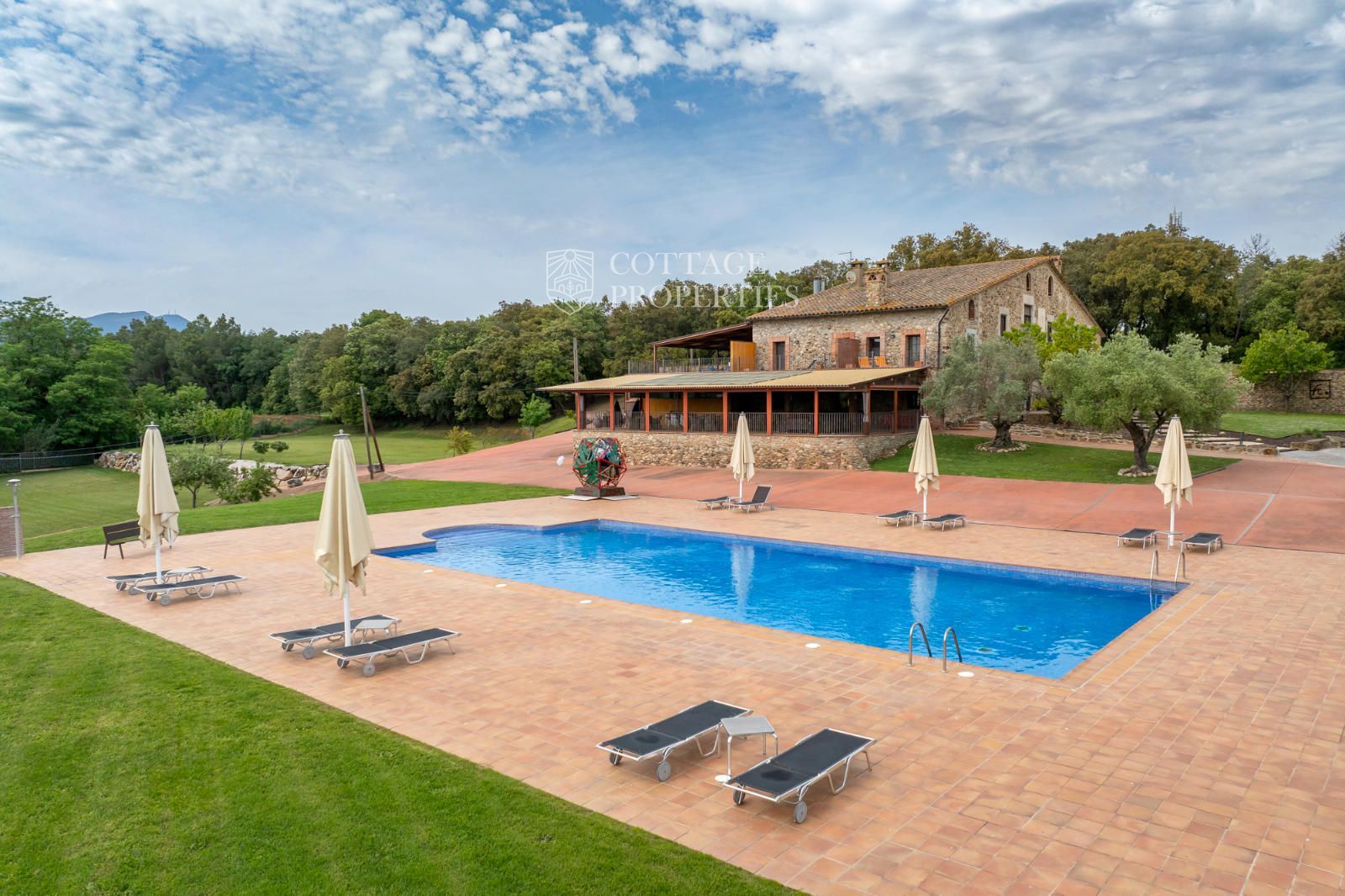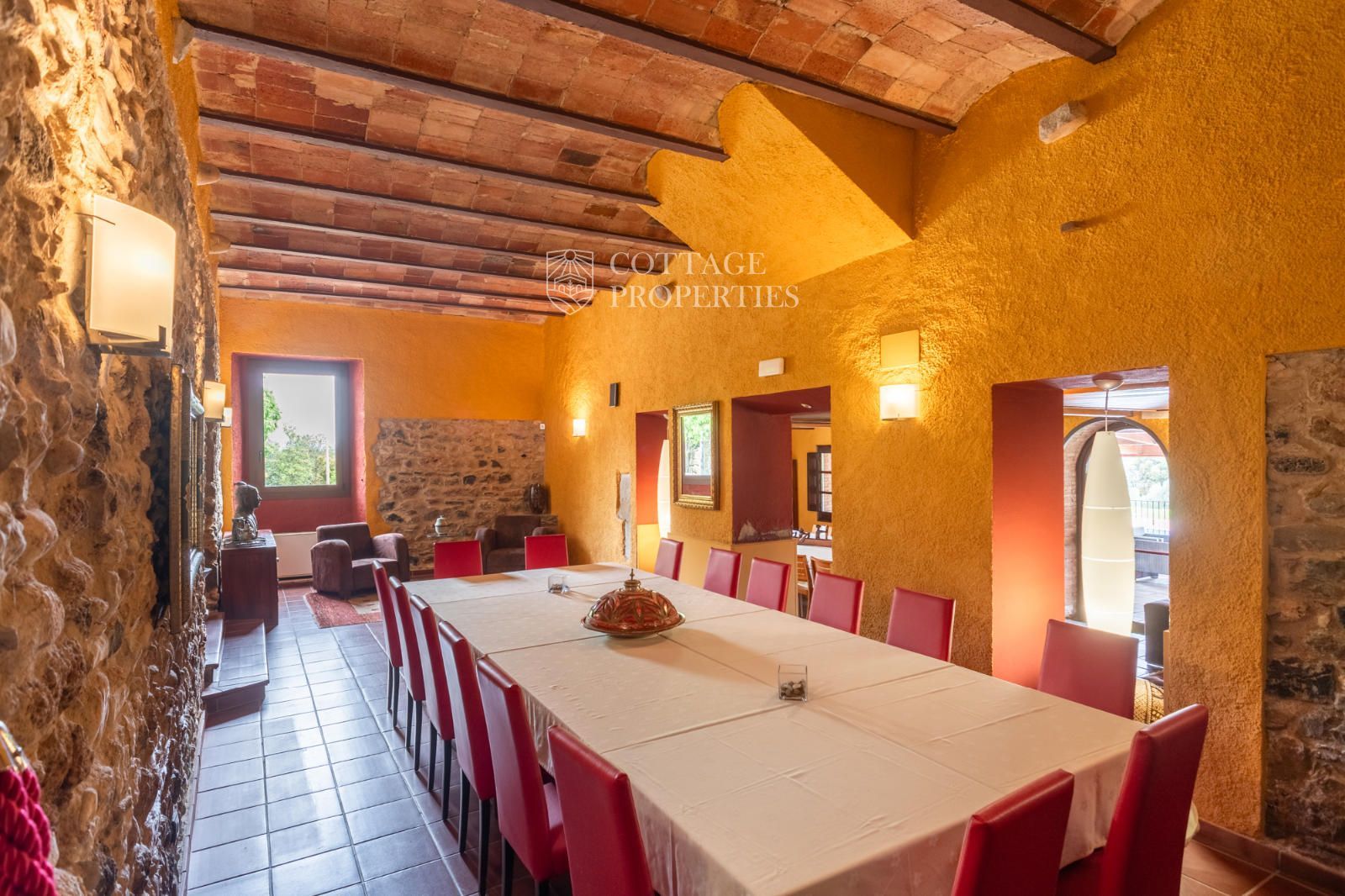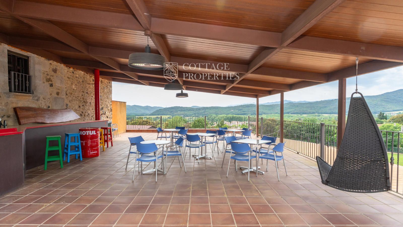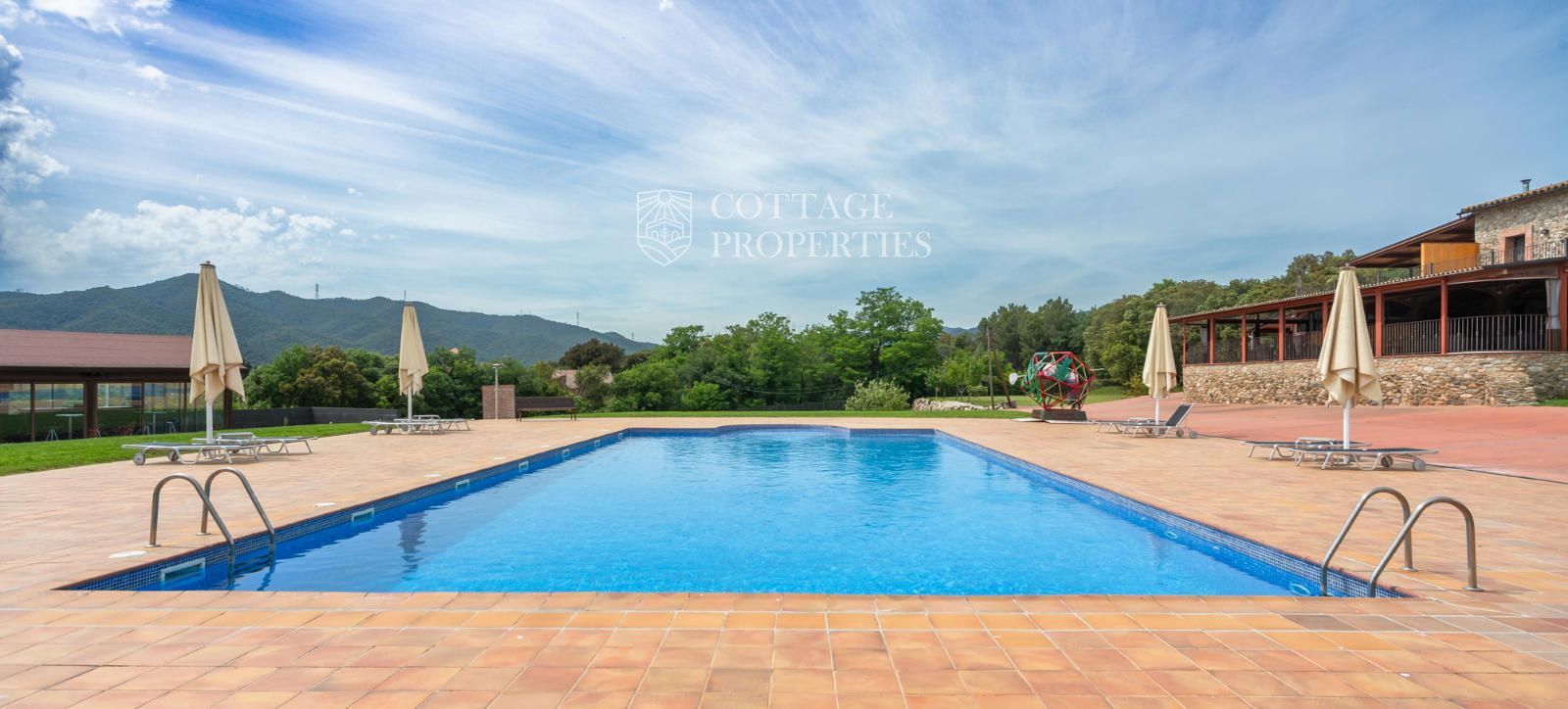 La masia comprend une accueillante salle de réception, une salle de réunion, un coin télévision avec bar, une cave, une bibliothèque, deux grandes salles à manger et une vaste cuisine professionnelle équipée pour le service traiteur. Une terrasse couverte, idéale pour les dîners d'été, communique avec les espaces extérieurs. Au premier étage, on trouve 9 chambres avec salle de bain privée, et au deuxième étage, les 3 chambres restantes, également avec salle de bain. Toutes les chambres sont équipées de climatisation, chauffage central, télévision et téléphone. Un bâtiment indépendant avec entrée privée, adjacent à la bâtisse principale, est actuellement en cours de rénovation pour être transformé en loft. De plus, dans le jardin, il y a une salle d'événements de 100 m² avec vue sur la vallée, et à l'étage inférieur se trouvent vestiaires, salle de sport, sauna et rangements.