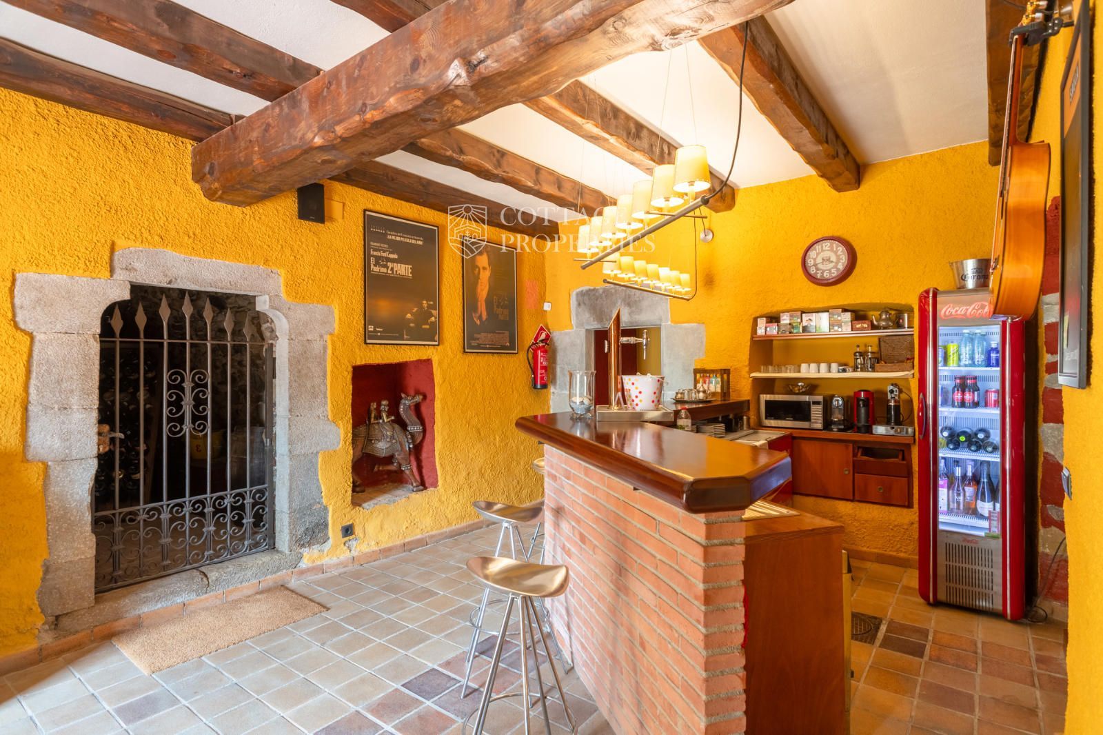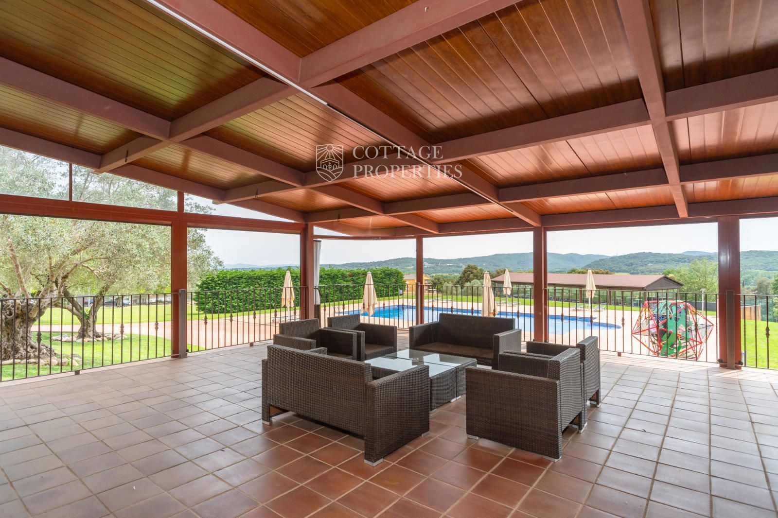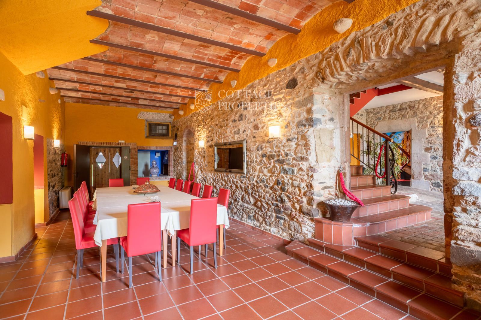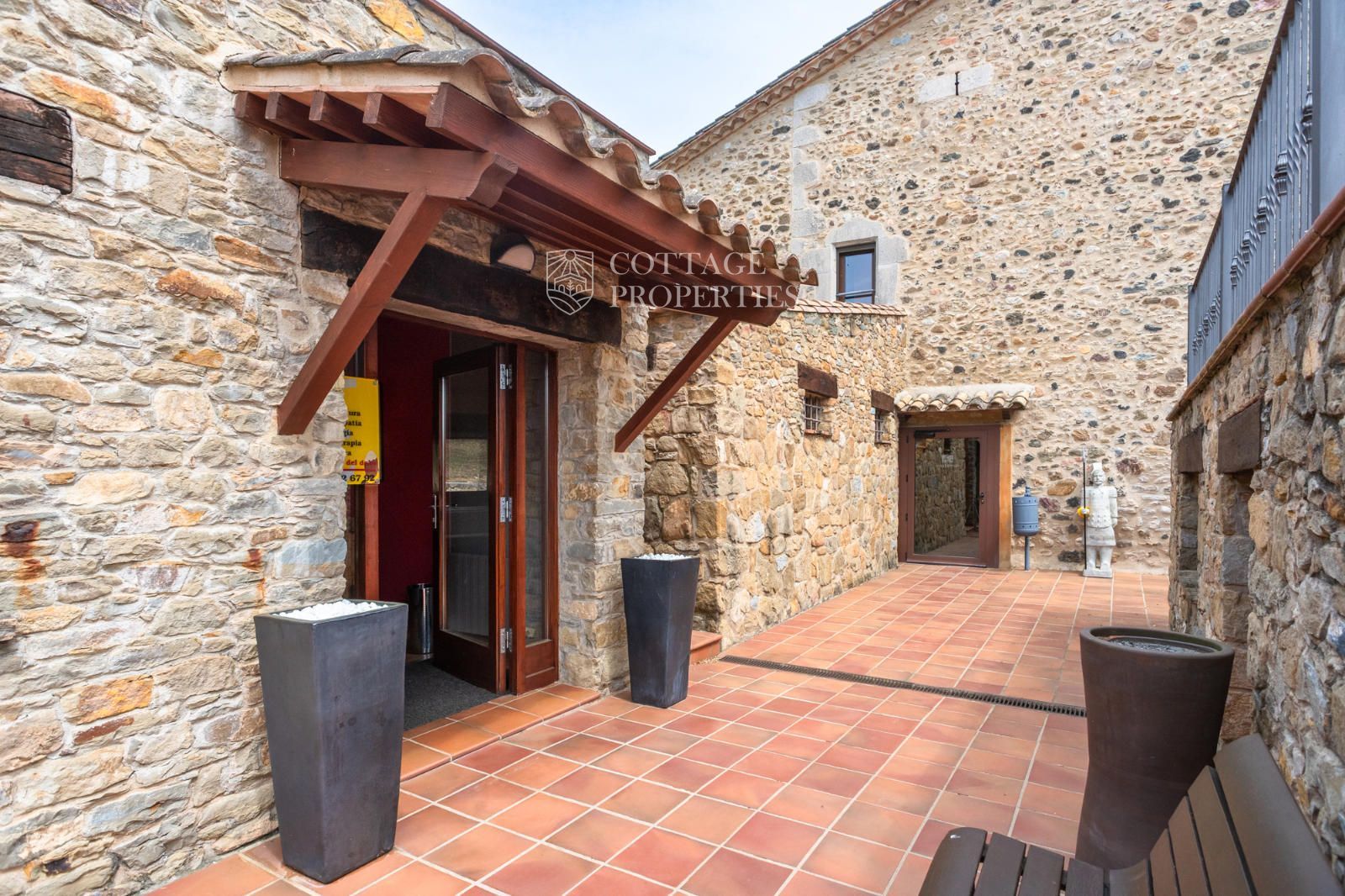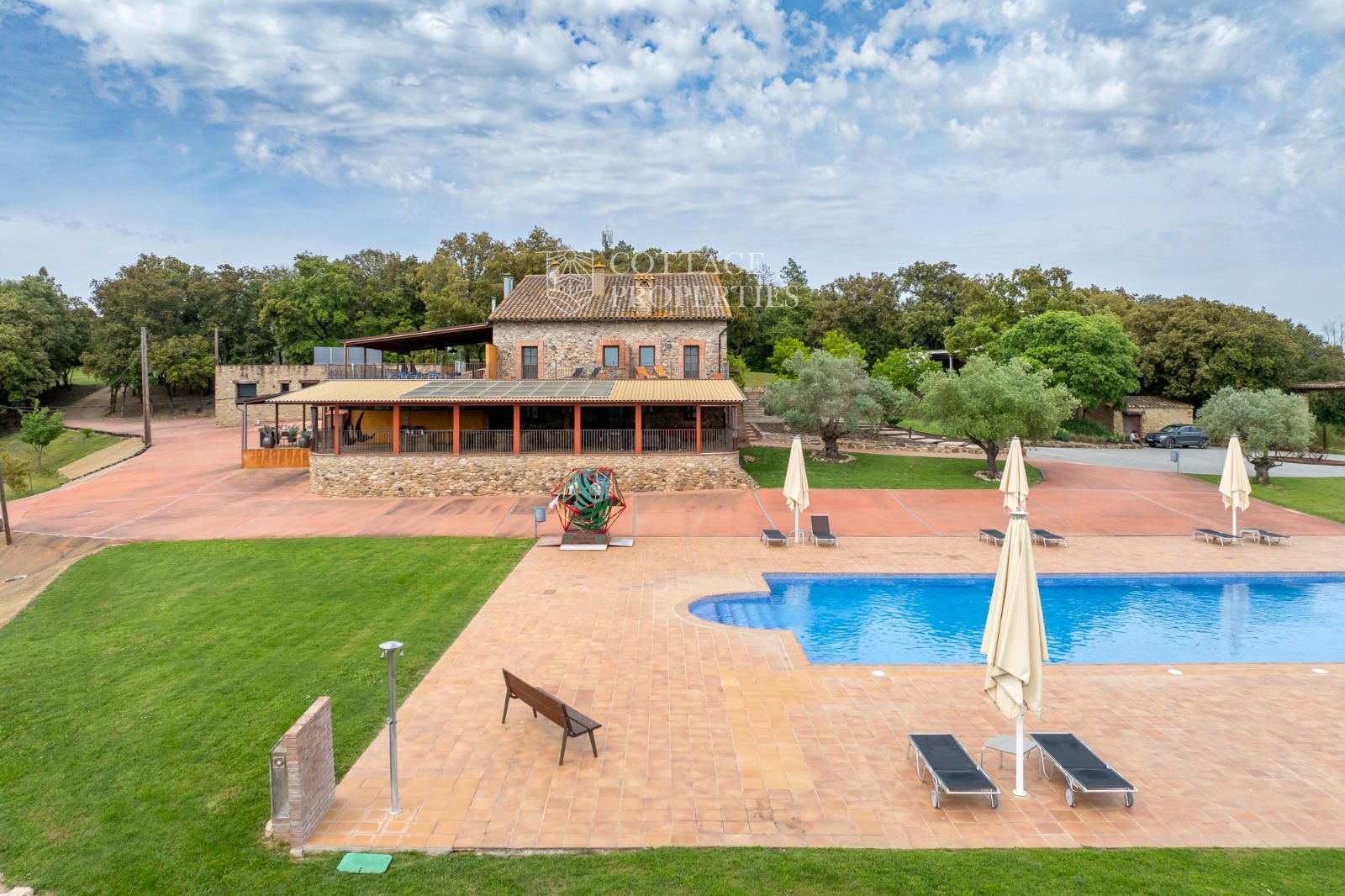 La masia comprend une accueillante salle de réception, une salle de réunion, un coin télévision avec bar, une cave, une bibliothèque, deux grandes salles à manger et une vaste cuisine professionnelle équipée pour le service traiteur. Une terrasse couverte, idéale pour les dîners d'été, communique avec les espaces extérieurs. Au premier étage, on trouve 9 chambres avec salle de bain privée, et au deuxième étage, les 3 chambres restantes, également avec salle de bain. Toutes les chambres sont équipées de climatisation, chauffage central, télévision et téléphone. Un bâtiment indépendant avec entrée privée, adjacent à la bâtisse principale, est actuellement en cours de rénovation pour être transformé en loft. De plus, dans le jardin, il y a une salle d'événements de 100 m² avec vue sur la vallée, et à l'étage inférieur se trouvent vestiaires, salle de sport, sauna et rangements.