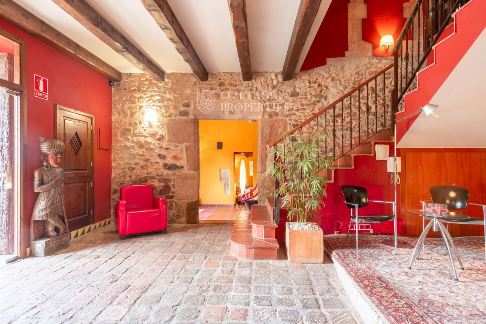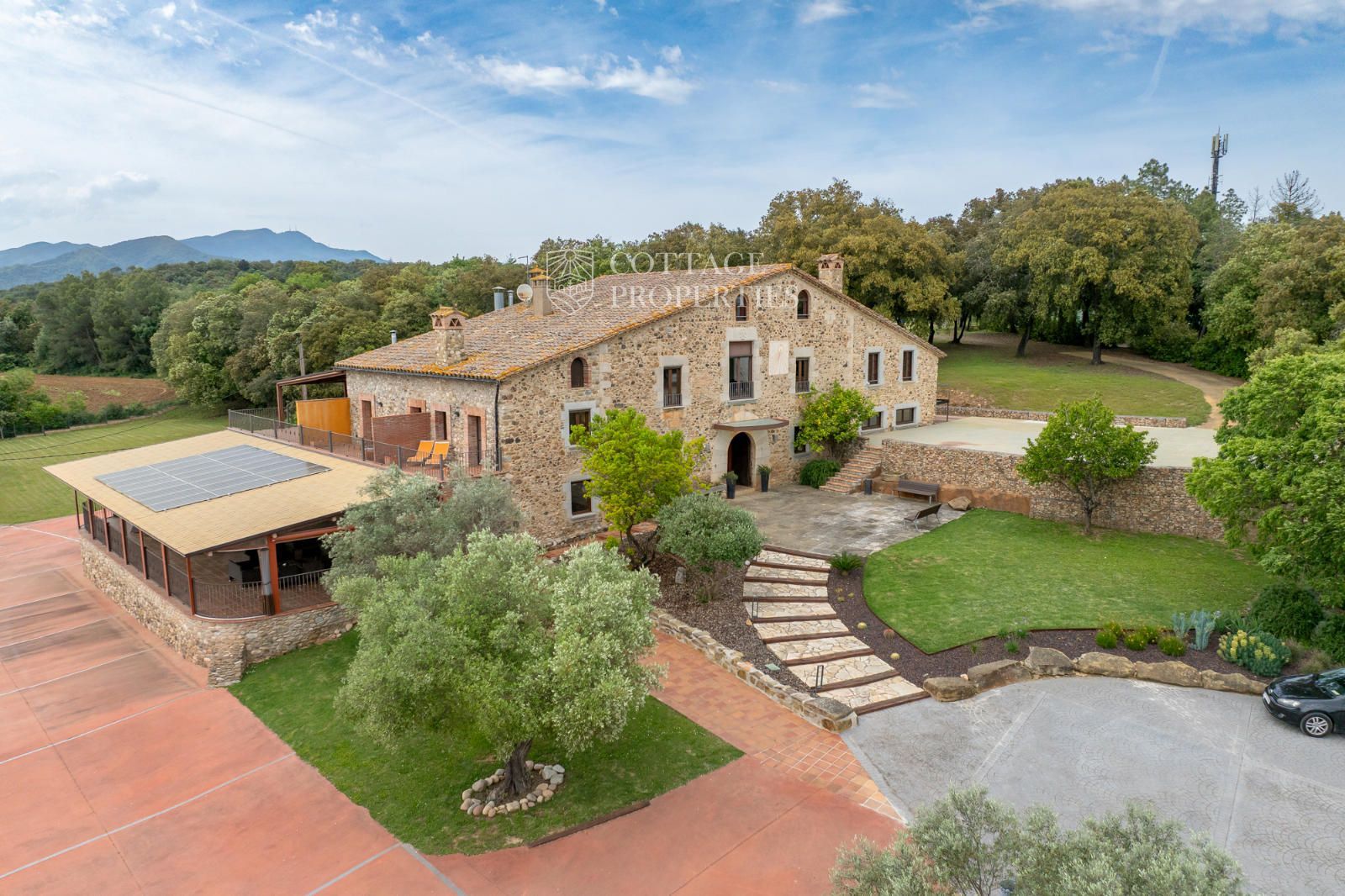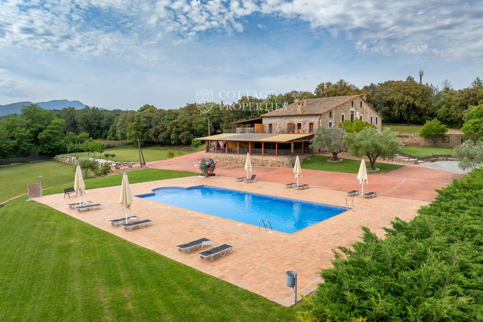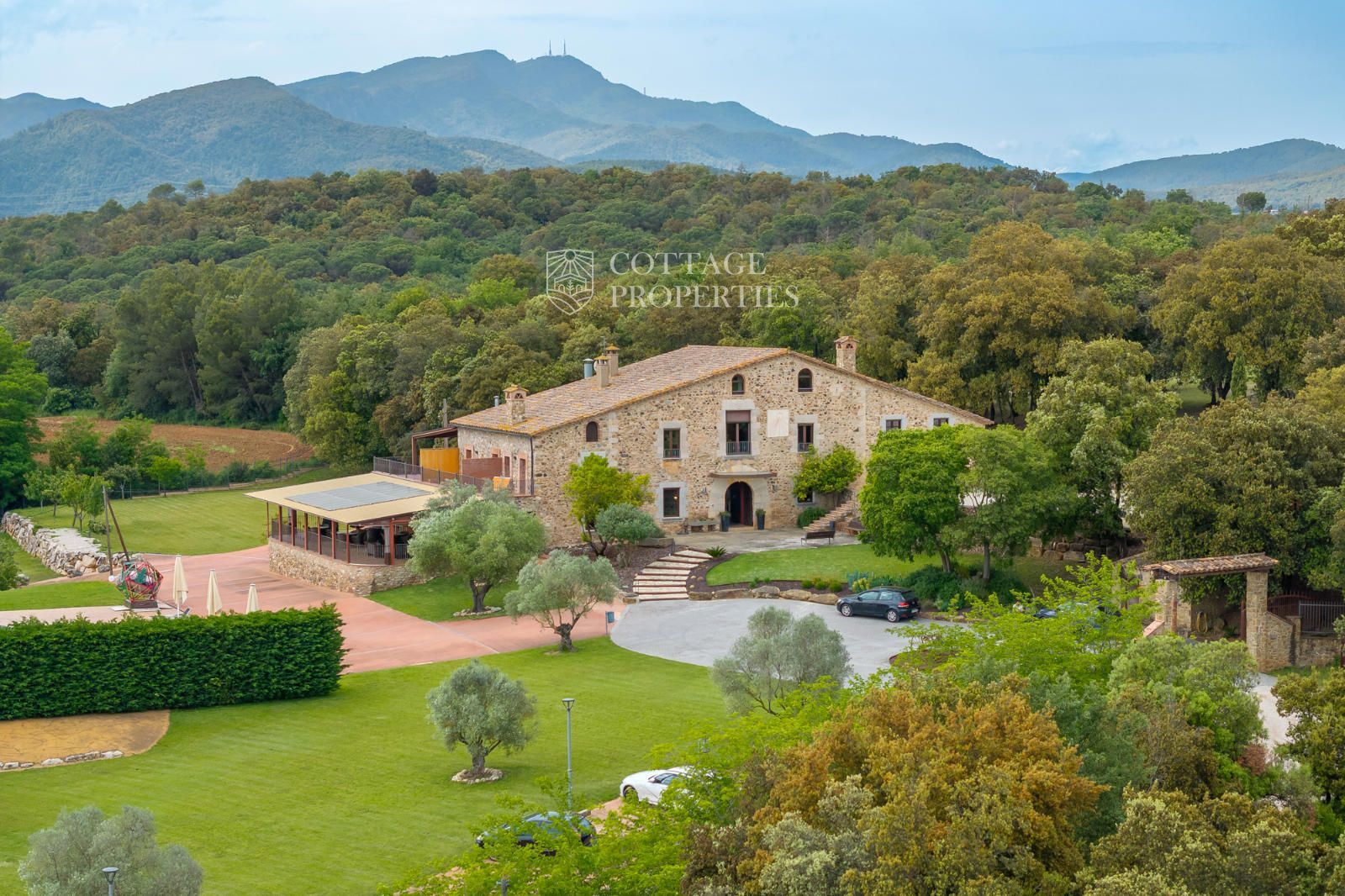 La masia comprend une accueillante salle de réception, une salle de réunion, un coin télévision avec bar, une cave, une bibliothèque, deux grandes salles à manger et une vaste cuisine professionnelle équipée pour le service traiteur. Une terrasse couverte, idéale pour les dîners d'été, communique avec les espaces extérieurs. Au premier étage, on trouve 9 chambres avec salle de bain privée, et au deuxième étage, les 3 chambres restantes, également avec salle de bain. Toutes les chambres sont équipées de climatisation, chauffage central, télévision et téléphone. Un bâtiment indépendant avec entrée privée, adjacent à la bâtisse principale, est actuellement en cours de rénovation pour être transformé en loft. De plus, dans le jardin, il y a une salle d'événements de 100 m² avec vue sur la vallée, et à l'étage inférieur se trouvent vestiaires, salle de sport, sauna et rangements.