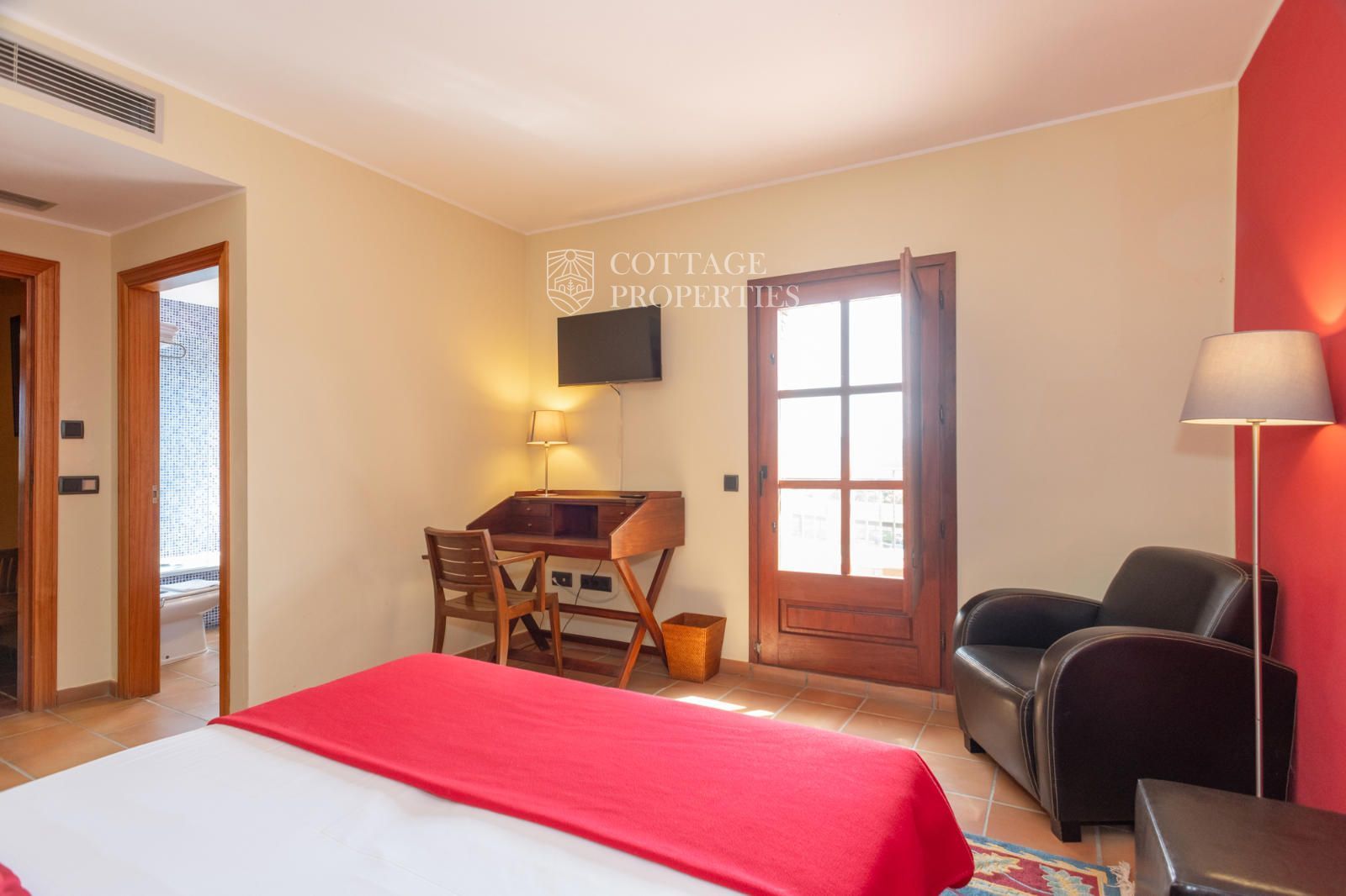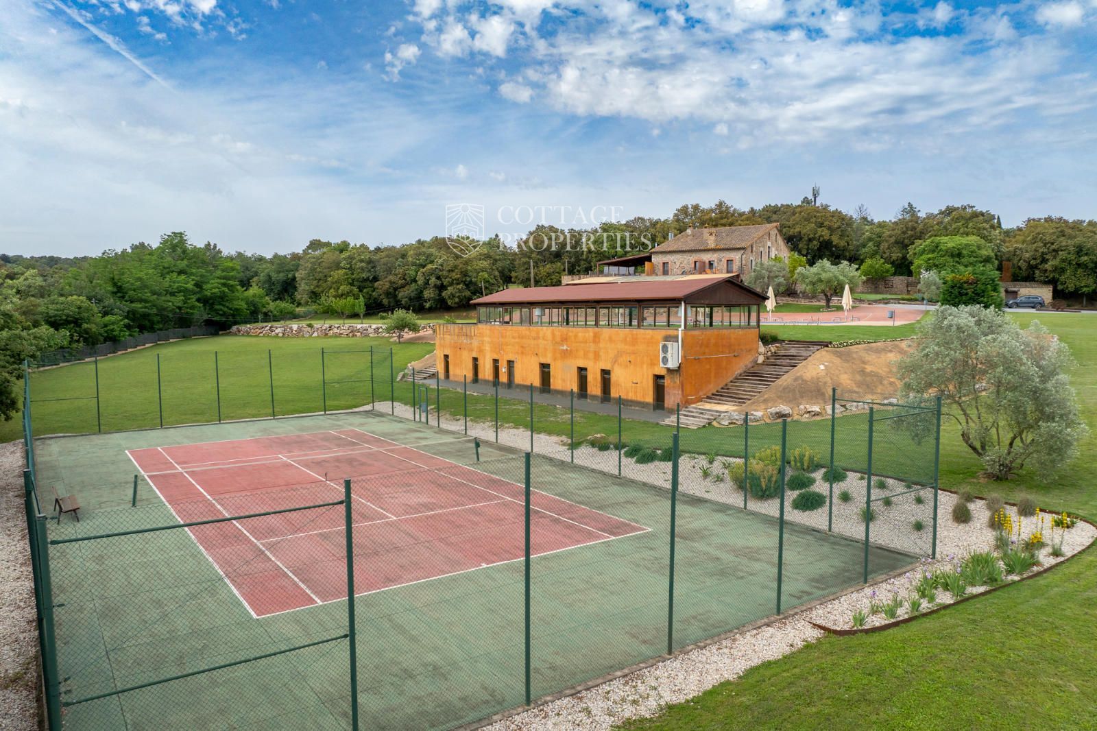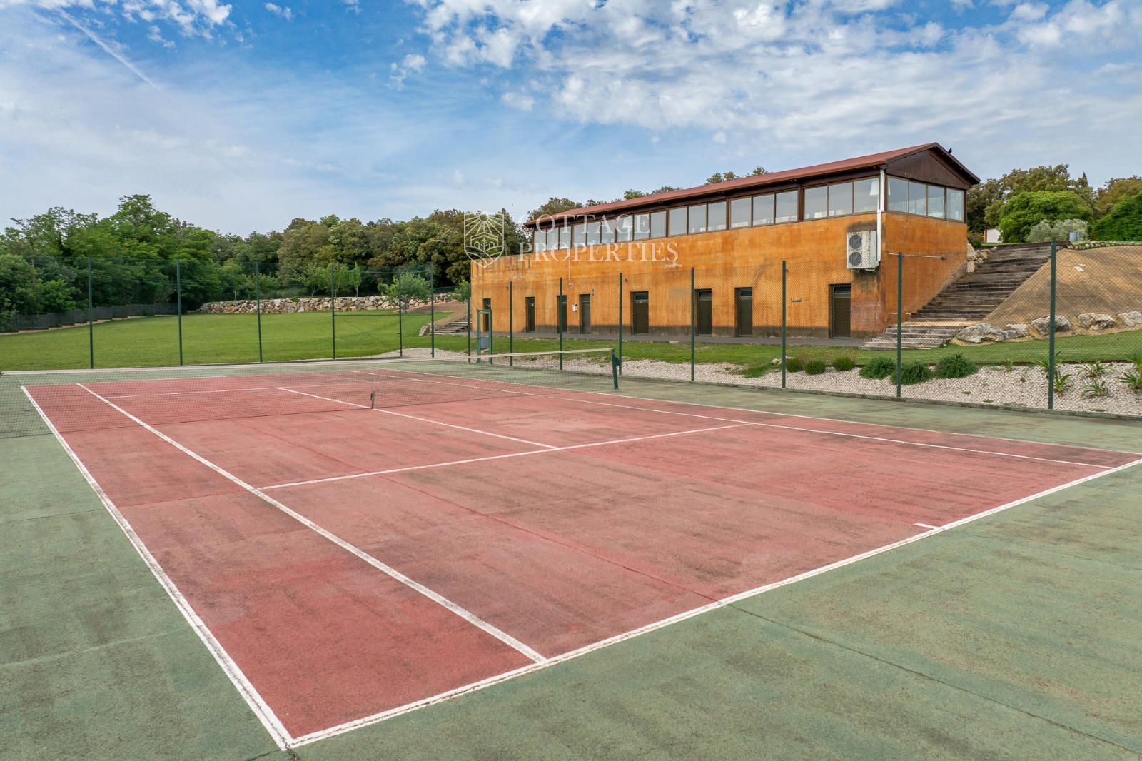 L'extérieur de la propriété comprend un magnifique jardin clôturé, une piscine de 150 m², un court de tennis, des zones de détente et un parking privé. Entouré par la nature, ce domaine devient un véritable oasis de sérénité avec une forte valeur ajoutée, idéal pour développer des retraites bien-être, des activités sportives ou des événements d'entreprise.