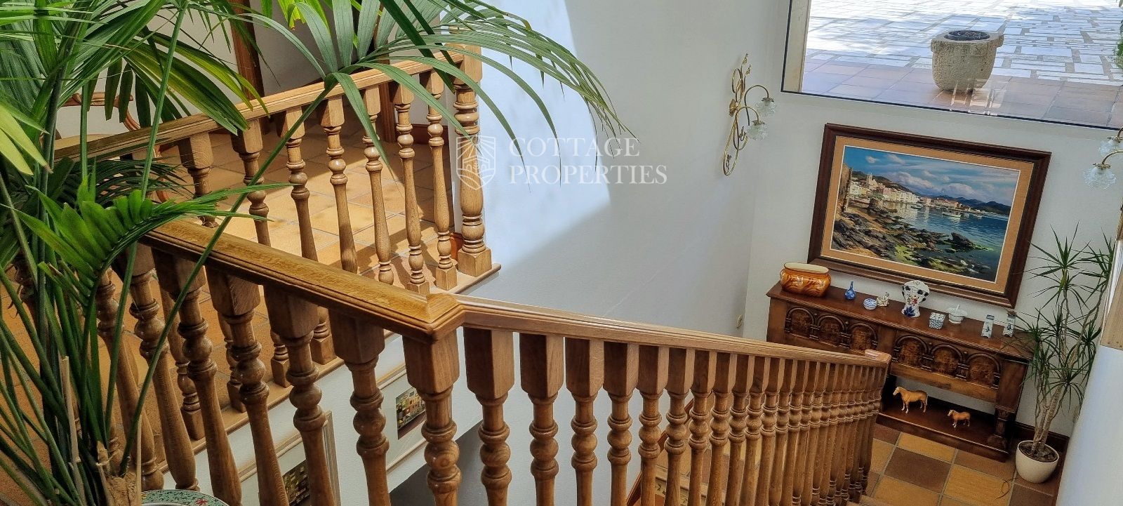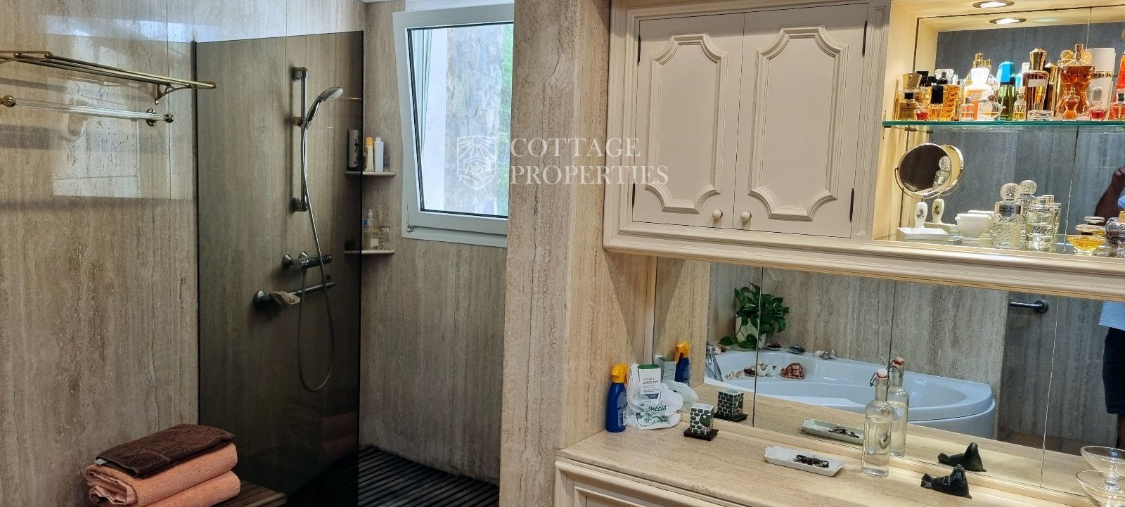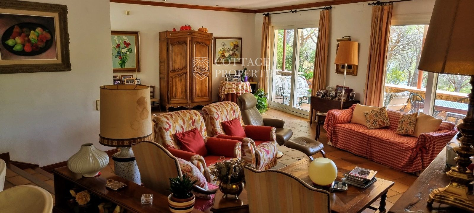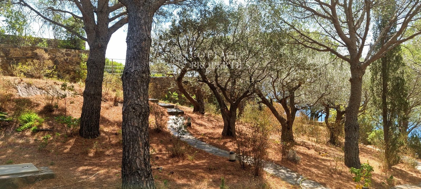 La villa comprend un hall d'entrée élégant, un vaste salon avec accès à une terrasse surplombant la mer, et une salle à manger au même niveau. Elle dispose également d'une grande cuisine, d'une buanderie et de 4 chambres, dont trois avec salle de bains privative. À l'étage supérieur, un palier donne accès à une salle de réunion avec une grande terrasse, une cave à vin, une salle de sport avec sauna, et 3 chambres avec salle de bains privative.