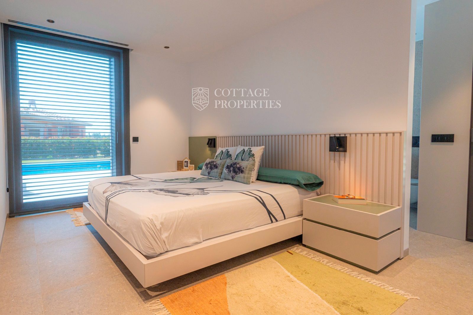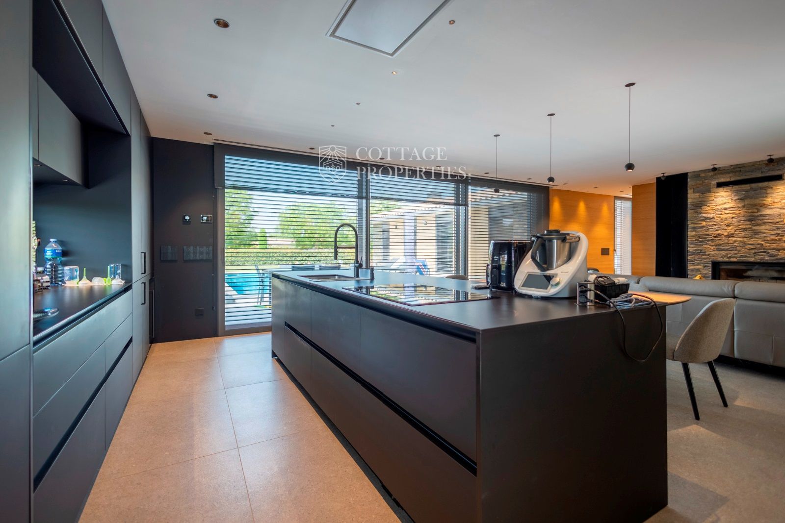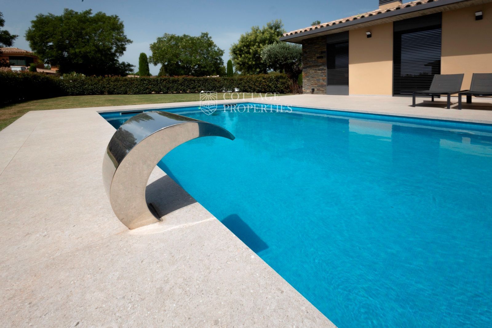 Depuis le salon-salle à manger, on accède directement au jardin privé avec une fantastique piscine d'eau salée, avec une cascade relaxante.