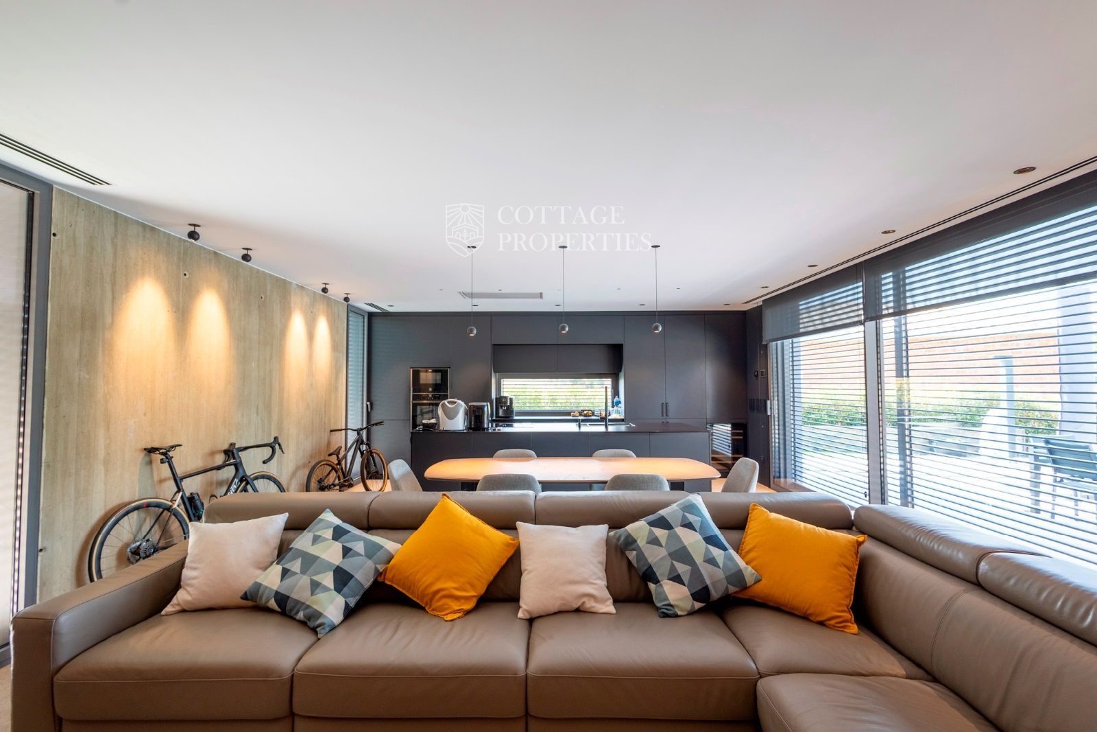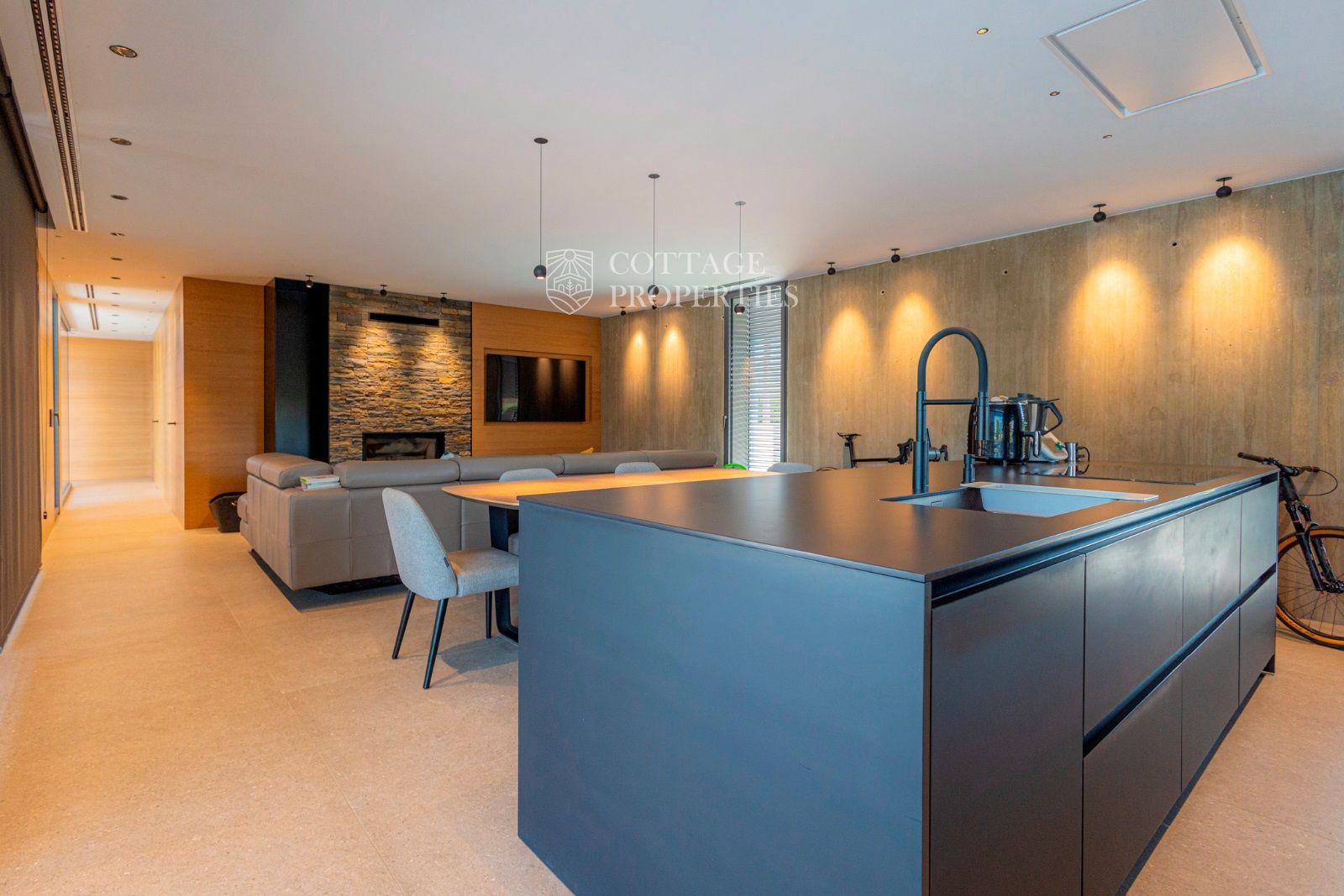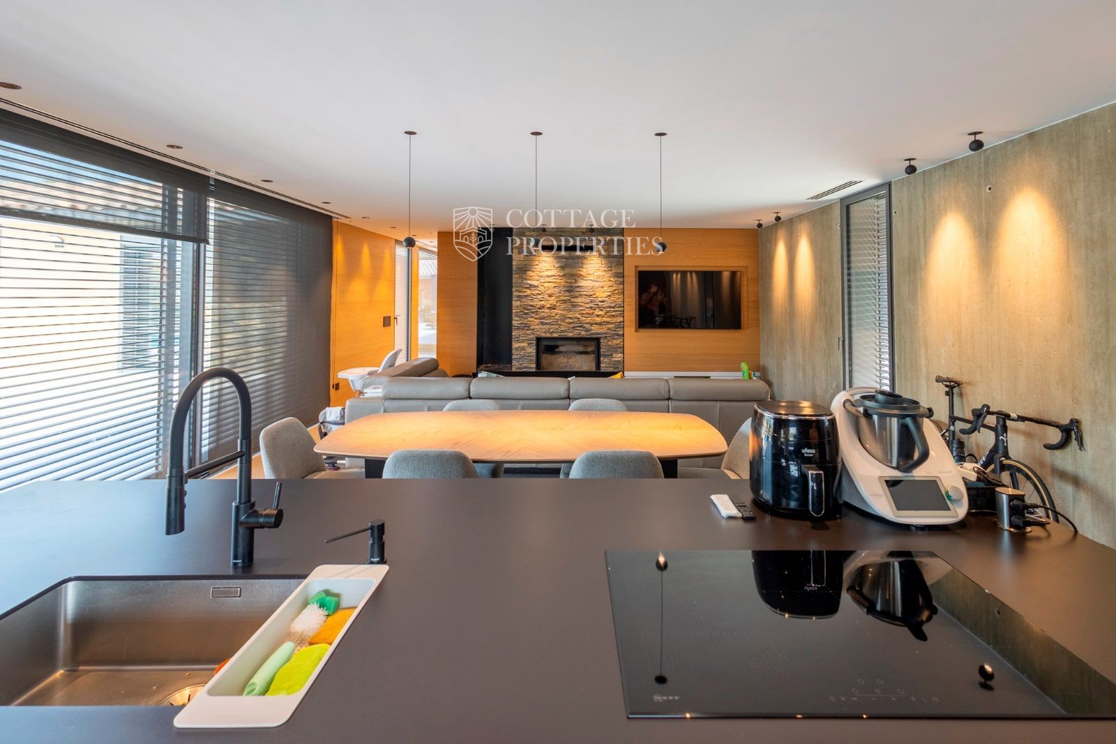 La maison de 220 m² construite sur un terrain de 921 m² est répartie sur un seul étage, disposant d'une zone de jour où se trouve une grande cuisine équipée d'appareils Neff. Dans le même espace, il y a le salon avec une grande télévision encastrée dans le mur et une cheminée pour profiter des meilleurs moments avec vos proches.