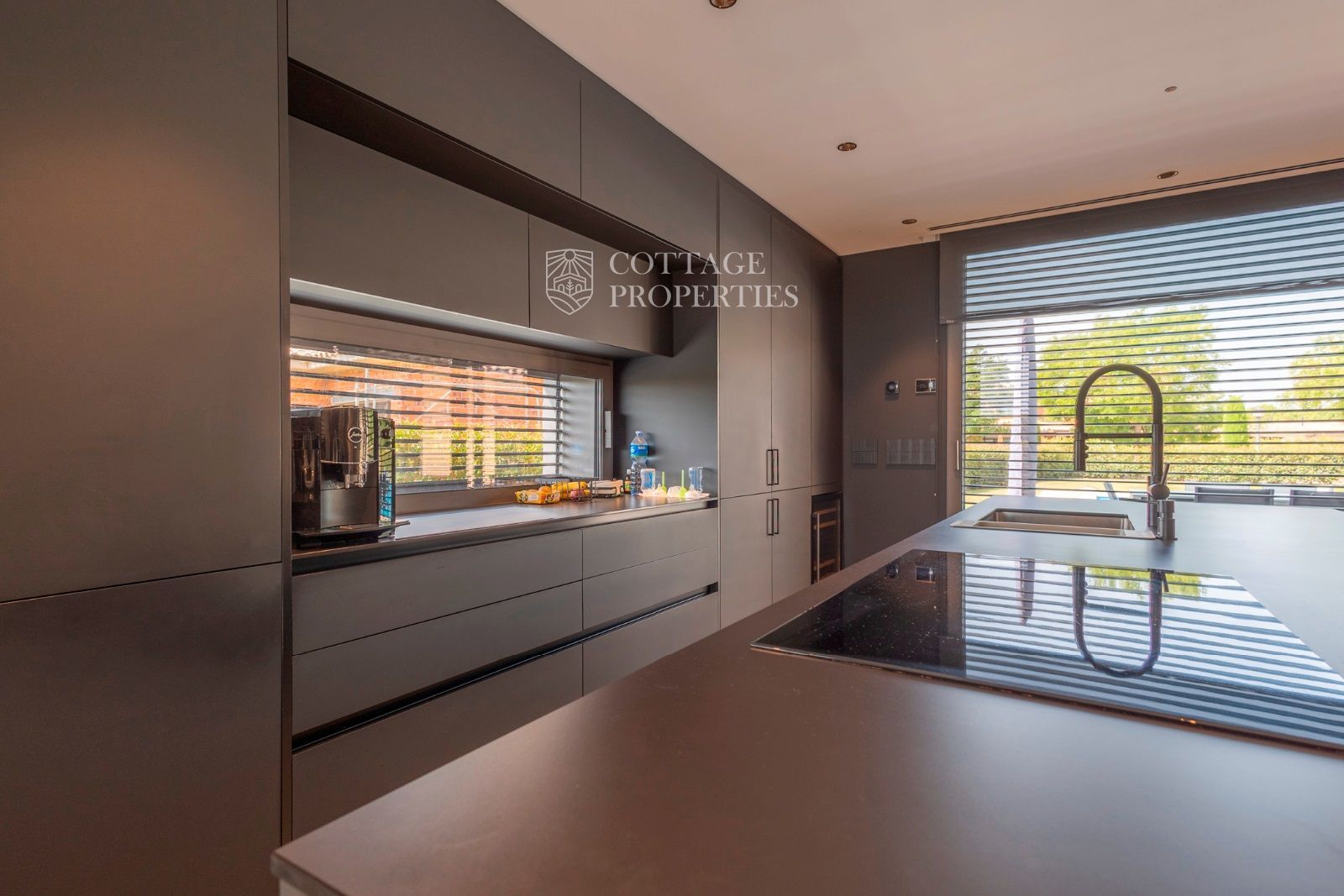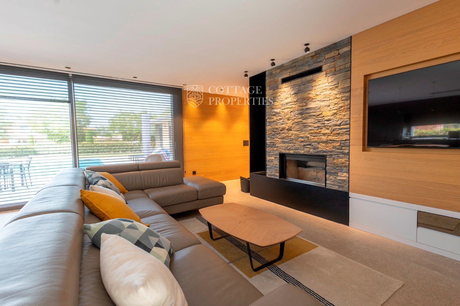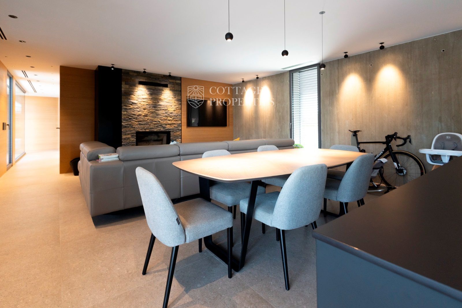 La maison de 220 m² construite sur un terrain de 921 m² est répartie sur un seul étage, disposant d'une zone de jour où se trouve une grande cuisine équipée d'appareils Neff. Dans le même espace, il y a le salon avec une grande télévision encastrée dans le mur et une cheminée pour profiter des meilleurs moments avec vos proches.