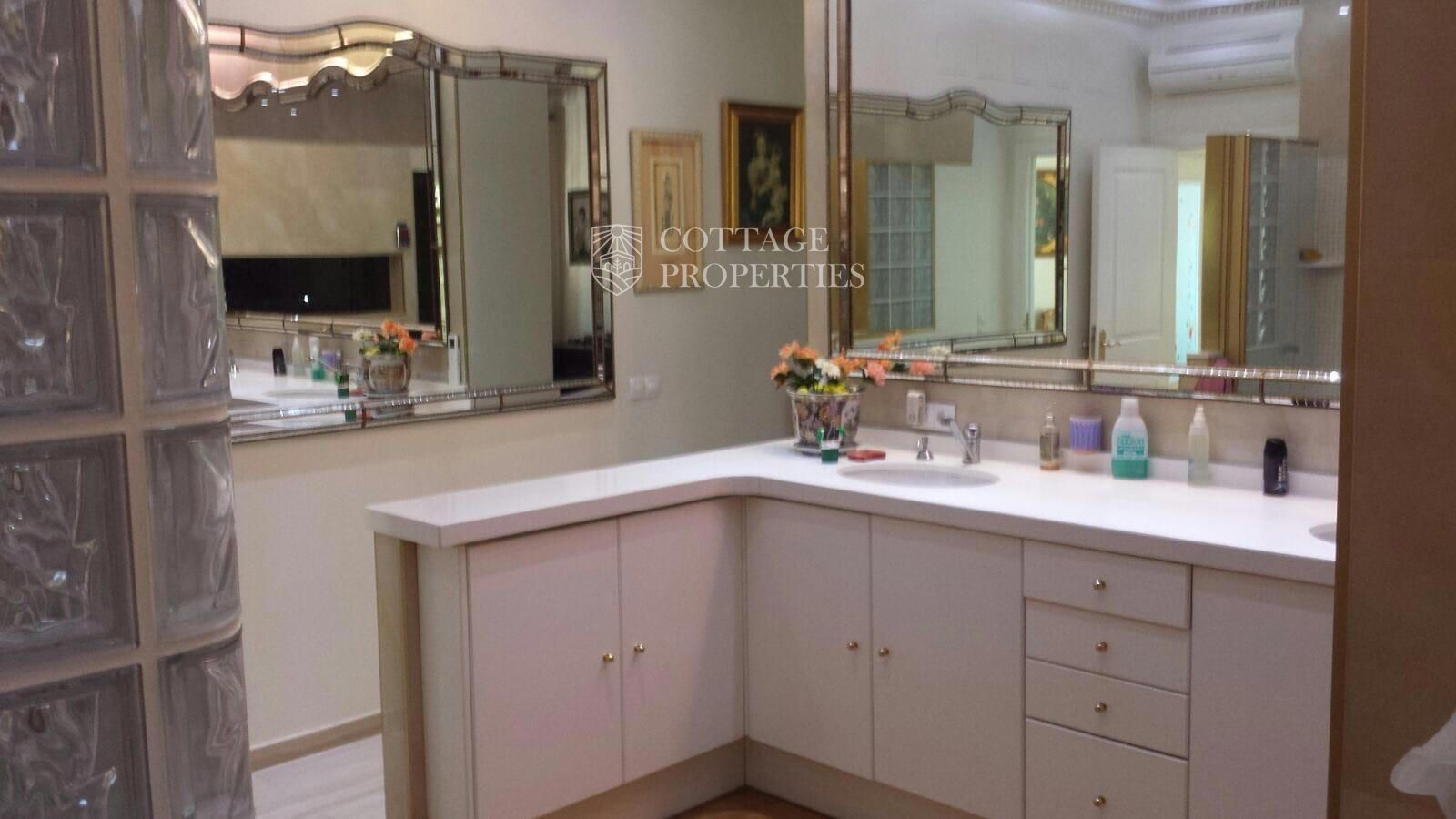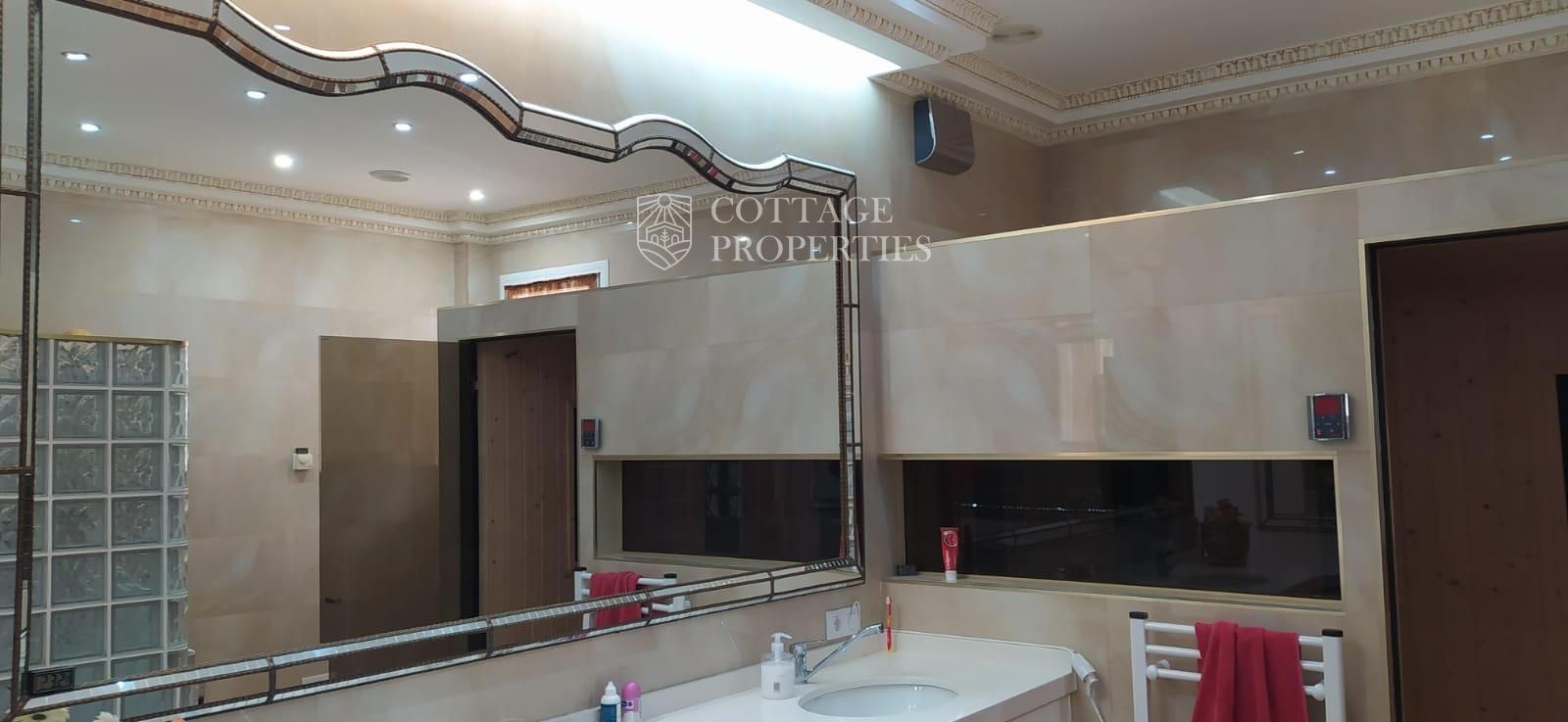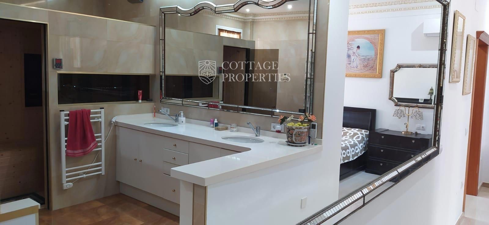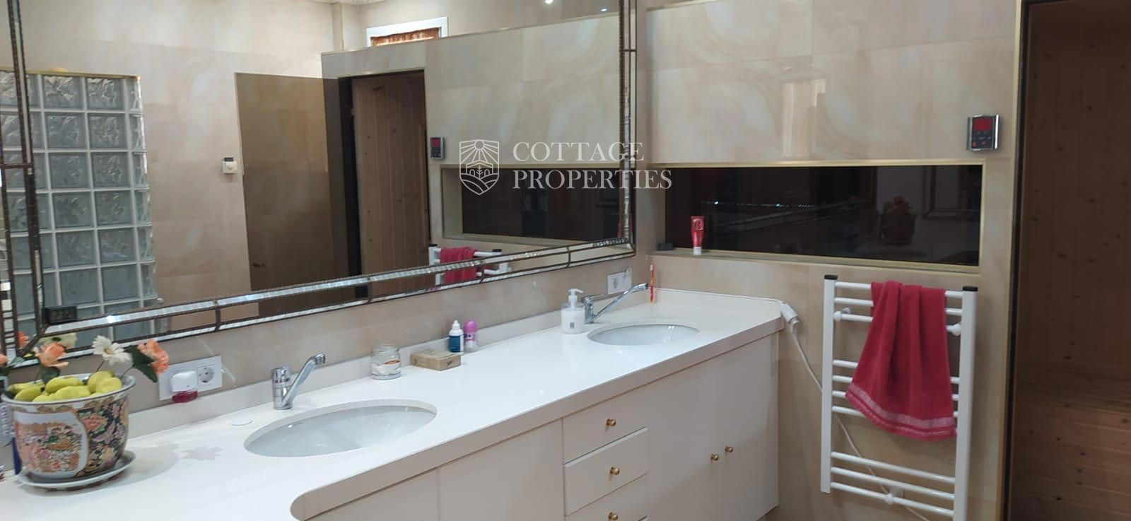 La villa comprend un salon élégant et lumineux équipé de la climatisation et de grandes fenêtres offrant des vues spectaculaires. La cuisine moderne, entièrement rénovée, dispose d'un îlot central et d'un accès direct aux vues extérieures. Le rez-de-chaussée abrite une grande chambre principale avec vue sur le jardin, climatisation et un grand dressing. L'une des salles de bains se distingue par sa taille et est équipée d'une douche et d'un sauna. La villa dispose également d'un immense garage pouvant accueillir plusieurs véhicules et d'un troisième étage lumineux avec des placards intégrés, idéal pour l'adapter selon les besoins. La terrasse supérieure offre un espace polyvalent avec des vues imprenables pour profiter de la tranquillité.