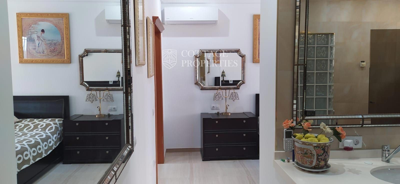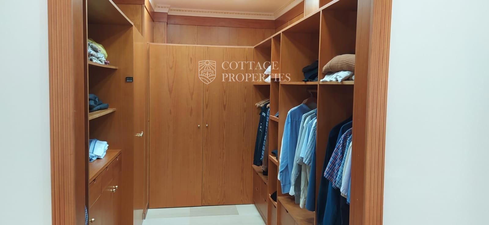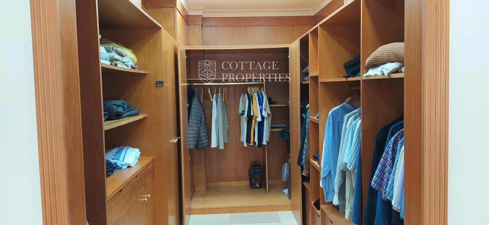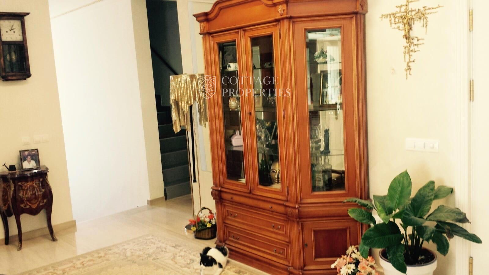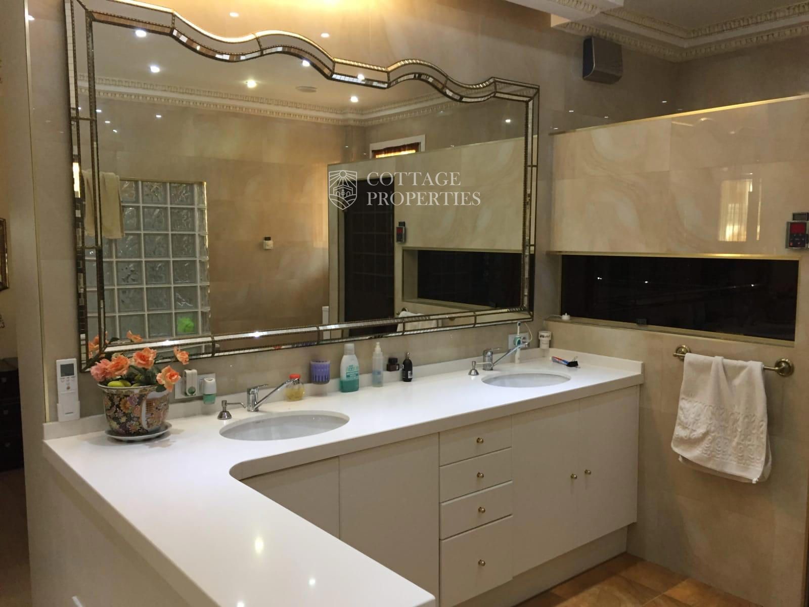 La villa comprend un salon élégant et lumineux équipé de la climatisation et de grandes fenêtres offrant des vues spectaculaires. La cuisine moderne, entièrement rénovée, dispose d'un îlot central et d'un accès direct aux vues extérieures. Le rez-de-chaussée abrite une grande chambre principale avec vue sur le jardin, climatisation et un grand dressing. L'une des salles de bains se distingue par sa taille et est équipée d'une douche et d'un sauna. La villa dispose également d'un immense garage pouvant accueillir plusieurs véhicules et d'un troisième étage lumineux avec des placards intégrés, idéal pour l'adapter selon les besoins. La terrasse supérieure offre un espace polyvalent avec des vues imprenables pour profiter de la tranquillité.